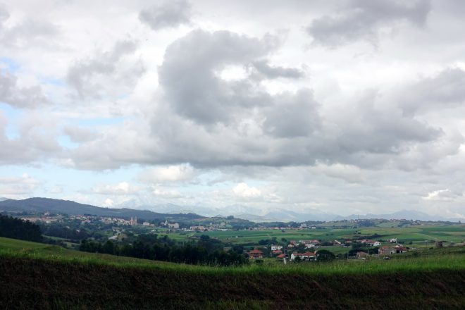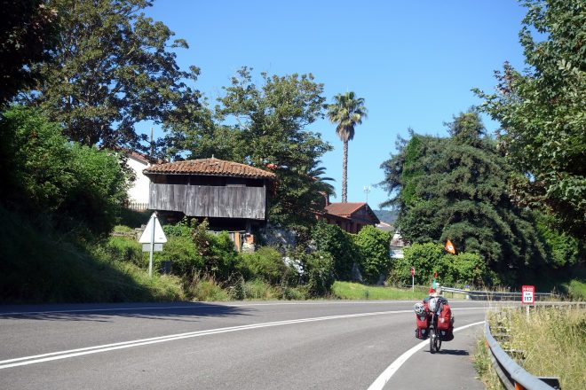 En fin d’après-midi nous quittons le Pays Basque et sa langue sympathique mais incompréhensible pour nous et entrons dans la province de Cantabria. Nous nous arrêtons dans un camping où nous avons droit à deux lits dans une sorte de tente fixe convertie en logement de pèlerins, ce qui nous évite de sortir notre tente. Le lendemain nous commençons à croiser beaucoup de pèlerins sur la route. Une grande partie du chemin (à pied) suit en fait la N634, donc les gens doivent souvent marcher sur la bande d’arrêt d’urgence de la route. On est bien contents d’être à vélo, au moins on a les descentes pour se reposer !