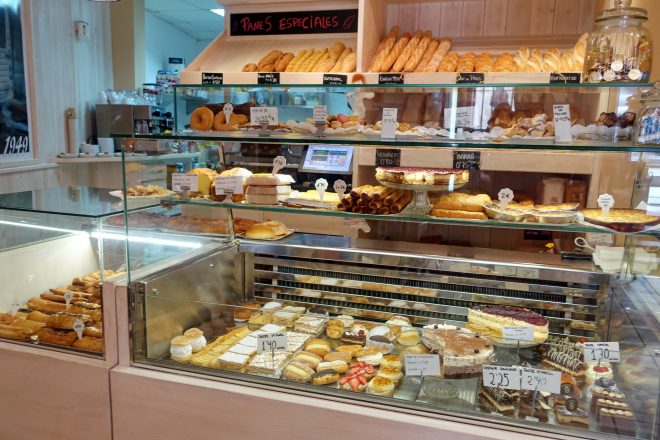 Lendemain, jour de pluie. La pluie vient par à-coups, comme une douche de 2 ou 3 minutes, puis s’arrête. Un vent tiède souffle sans arrêt et nous sèche en quelque minutes, puis ça recommence. Nous ne sortons même pas nos pantalons de pluie. Après quelques montées-descentes comme ça, nous nous arrêtons dans une boulangerie qui ferait le bonheur de tous les cyclo-voyageurs du monde (en plus elle est ouverte – contrairement à la France la plupart des boulangeries en Espagne semblent être ouvertes quand nous arrivons).