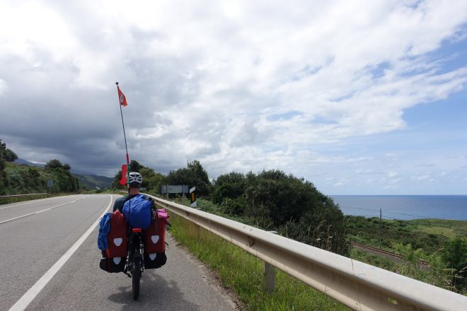 Après cette petite pause, on continue sur deux roues, avec le soleil, des températures agréables et le vent dans le dos. Tout est assez parfait jusqu’à la première pause café, où on apprend l’attentat de Nice à la télé. Ça pèse un peu sur le moral pour le reste de la journée…