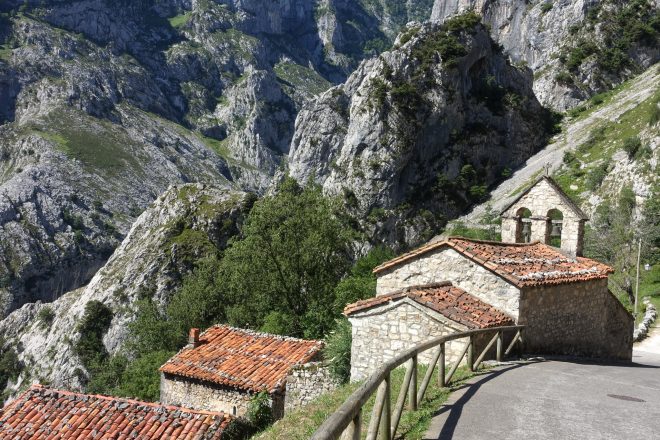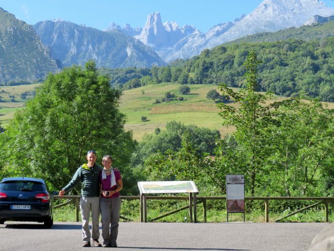 On décide d’aller voir ces montagnes d’un peu plus près. Mais pas à vélo. Parce que montagne = montée, parce qu’on veut quand même arriver au Portugal début août pour nos vacances à la plage, et parce que de temps en temps on a besoin de se dégourdir les jambes. Donc, arrêt à Llanes, petite ville au bord de la mer, on prend une petite chambre d’hôtel, on pose les vélos dans le garage de l’hôtel (et on met aussi notre tente mouillée avec), et on s’en va louer une voiture. Une QUOI ? demandez-vous… oui une voiture, une vraie, avec quatre roues et un moteur qui consomme de l’essence. Et on l’aura bien utilisée… on prend toute une journée pour rouler dans le parc national des Picos de Europa, on passe par des cols et des vallées magnifiques, on regarde des vues grandioses.