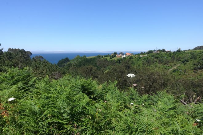 Nous roulons dans une région où les plages sont remplacées par des falaises, les villages sont perchés à 100-200 mètre au-dessus de la mer, et tous les quelques kilomètres il y a une rivière qui se jette dans la mer. Sur la route nationale, ça donne un enchaînement de montées (couronnées par des vues sur l’Atlantique) et de descentes dans des vallées vertes et ombragées, avec l’autoroute qui passe haut par-dessus nos têtes sur d’immenses viaducs (voir ici pour plus de photos).