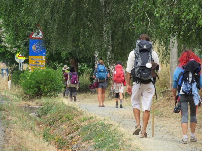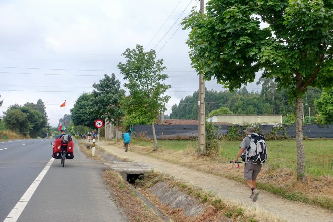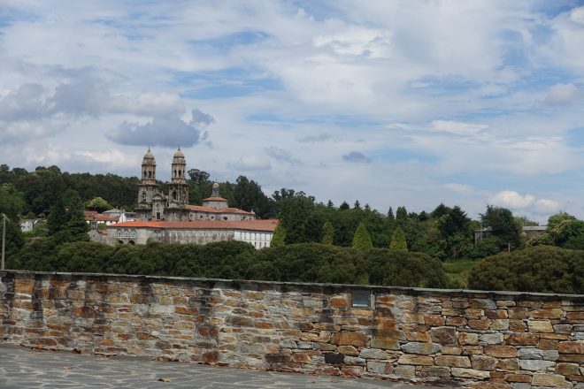 A Arzúa la route rejoint le Camino Francès (le plus fréquenté), le village est plein de pèlerins, en tout cas jusqu’à 22h, heure à laquelle les auberges de pèlerins ferment leurs portes (et ils doivent être dehors à 8h du matin…. Nous, on préfère les pensiones). Une dernière petite étape pour Santiago, la densité de pèlerins augmente de plus en plus, il y en a de toutes sortes, ceux avec grand sac à dos et chaussures de randonnée, et ceux qui font transporter leurs bagages et se promènent avec un sac en plastique dans la main.