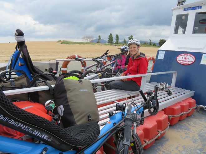 Nous sommes en route pour Santander et il y a deux bateaux qui nous raccourcissent passablement la route, la route nationale faisant de grands détours à cause des rivières. Le premier bateau est assez petit, et monter nos vélos et sacoches depuis la plage est toute une aventure !