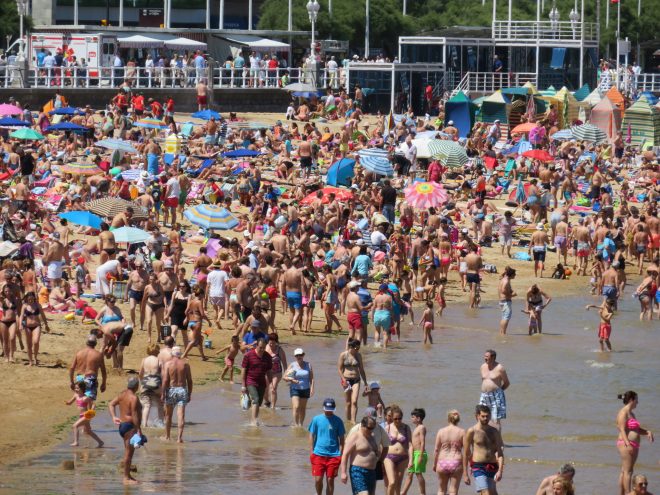 On continue le lendemain avec le soleil et les vues sur l’Atlantique. En arrivant à Gijón, on retrouve une piste cyclable et une plage bondée qui ne nous donne vraiment pas envie !