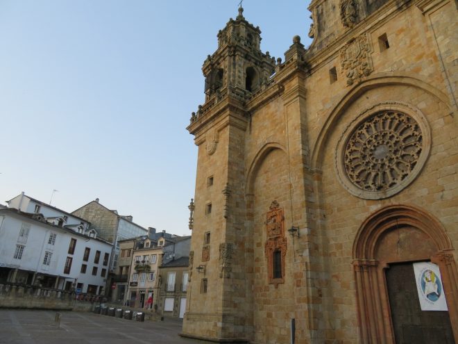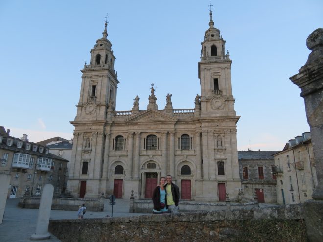 La montée le lendemain n’est pas aussi difficile qu’attendu, c’est une route large et tranquille qui monte assez doucement. Après cette montée nous décidons de dévier un peu du Camino pour rejoindre Lugo, petite ville connue pour sa cathédrale et ses murs romains héritage Unesco. Pour y arriver nous empruntons une route de campagne toute droite.
