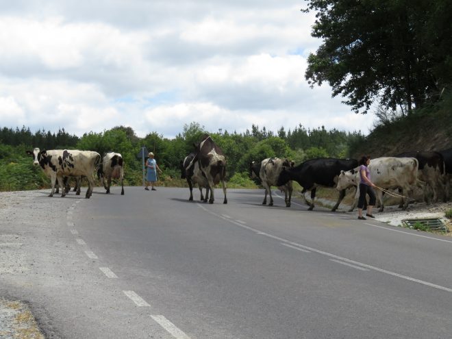 Nous allons aussi au centre d’information sur le Camino de Santiago, nous aimerions savoir quelle est la meilleure route à prendre à vélo, pour éviter la circulation. La gentille dame nous dit qu’il faut prendre le chemin pour piétons, il est très bien marqué, qu’elle n’a pas d’autre information à nous donner… et oui oui, elle nous assure que le chemin est asphalté sur toute la longueur jusqu’à Santiago, comme celui-ci vous voyez, en pointant sur une photo derrière elle… d’un chemin de forêt clairement non asphalté. Merci Madame, c’est très gentil, et on s’en va interroger Google. En plus une partie du chemin semble suivre une ancienne route romaine… Pour finir on choisit une route provinciale un peu plus au nord du chemin, ce qui s’avère un très bon choix, car c’est une excellente route où nous sommes presque seuls. Il y a presque plus de vaches que de voitures…