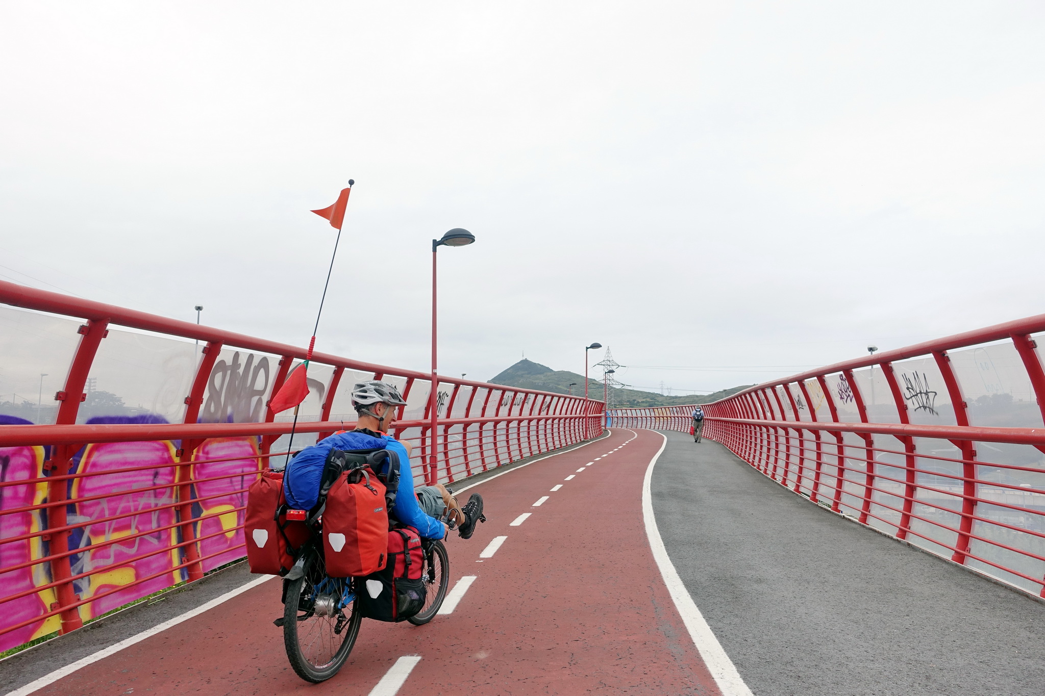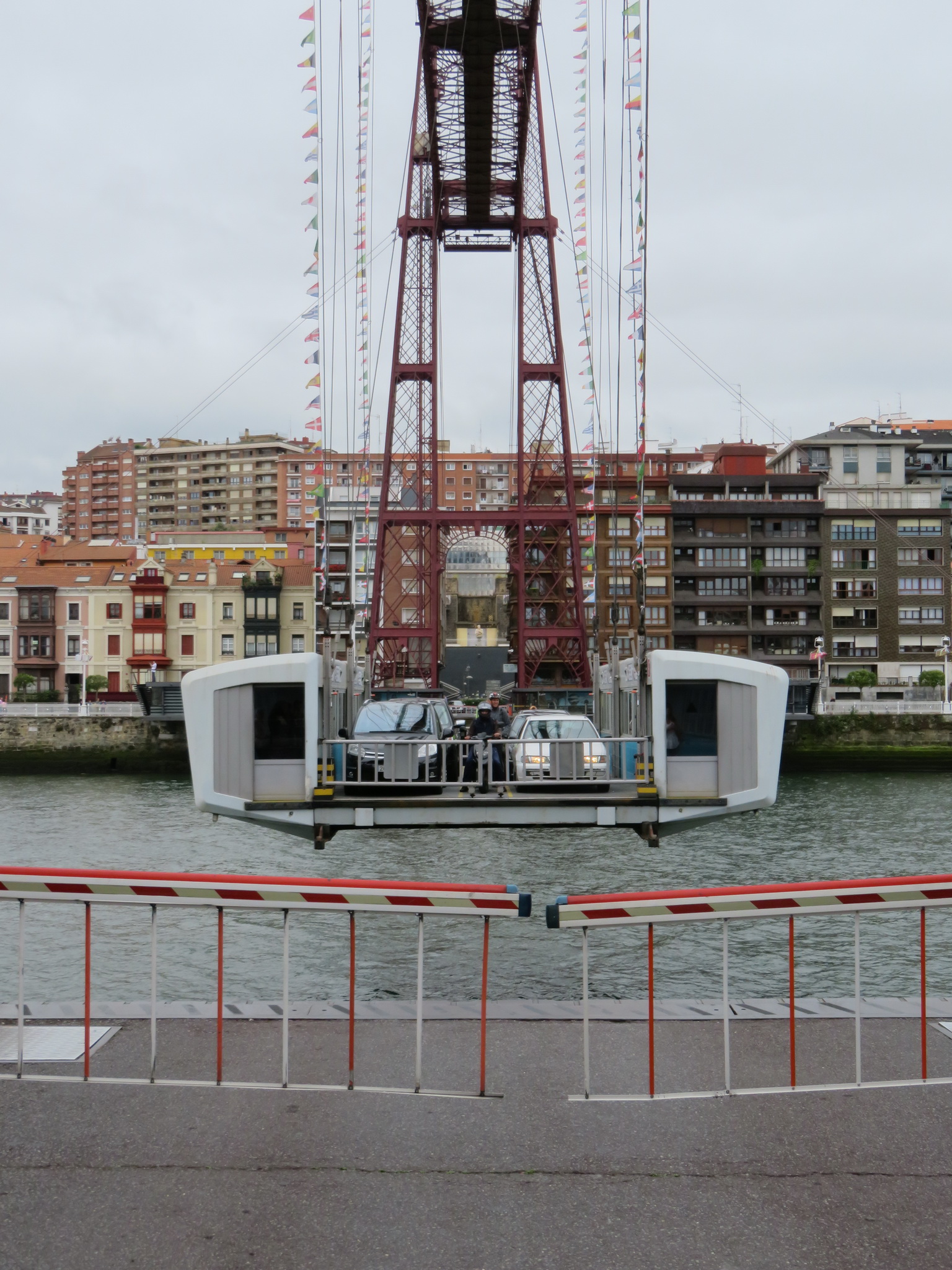 Après notre weekend repos à Bilbao nous reprenons donc le chemin, sachant qu’il nous reste environ 600 km jusqu’à Santiago. Nous quittons Bilbao par un petit détour, car nous avons envie de prendre la Ponte de Biscaya, un « vrai » pont suspendu !