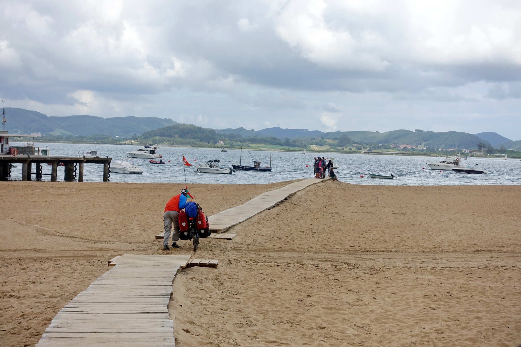 Nous sommes en route pour Santander et il y a deux bateaux qui nous raccourcissent passablement la route, la route nationale faisant de grands détours à cause des rivières. Le premier bateau est assez petit, et monter nos vélos et sacoches depuis la plage est toute une aventure !