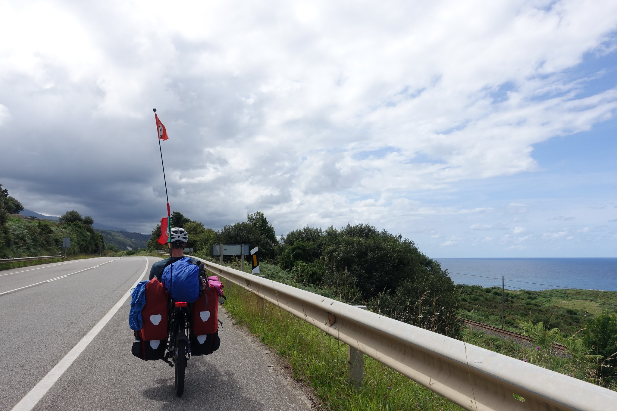 En fin d’après-midi nous quittons le Pays Basque et sa langue sympathique mais incompréhensible pour nous et entrons dans la province de Cantabria. Nous nous arrêtons dans un camping où nous avons droit à deux lits dans une sorte de tente fixe convertie en logement de pèlerins, ce qui nous évite de sortir notre tente. Le lendemain nous commençons à croiser beaucoup de pèlerins sur la route. Une grande partie du chemin (à pied) suit en fait la N634, donc les gens doivent souvent marcher sur la bande d’arrêt d’urgence de la route. On est bien contents d’être à vélo, au moins on a les descentes pour se reposer !