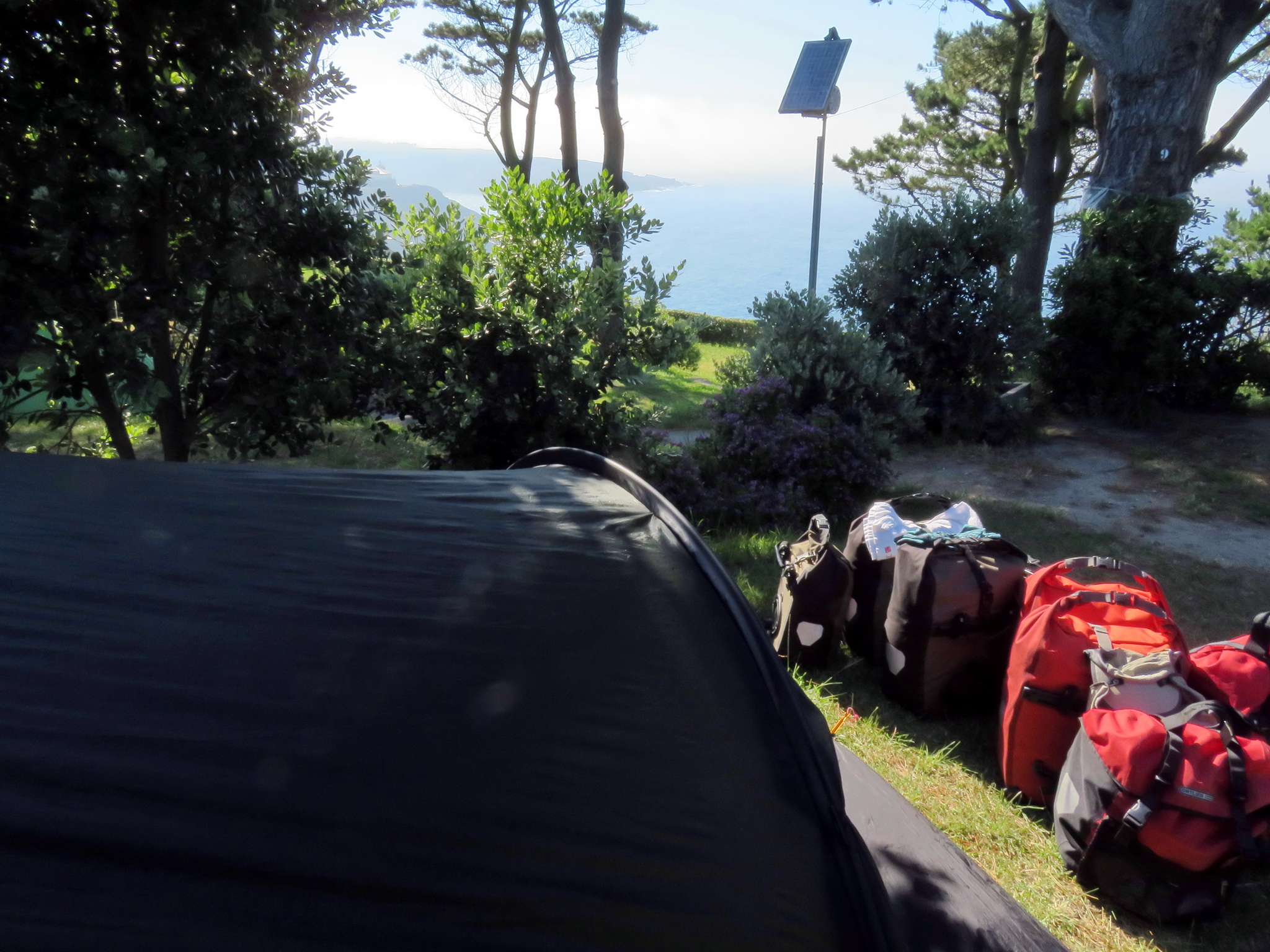 C’est beau, mais c’est fatigant. A la fin de cette journée, nous arrivons dans un camping au-dessus de Luarca, village en bord de mer. Nous pouvons choisir entre deux emplacements pour notre tente : avec vue sur la mer, ou avec vue sur la mer. Il y a une salle de picnic où on peut cuisiner avec notre réchaud, des machines à laver, Wifi, un supermercado (bon ok le terme était légèrement exagéré, c’était plutôt une sorte de dépannage mais ils avaient du yogourt pour le petit déjeuner), des cordes à linge pour aérer nos sacs de couchage (odeur de chien mouillé, toujours…). Bref, le bonheur. On vous laisse deviner la nationalité des propriétaires… (il n’y a qu’une nation dans le monde qui fait des campings aussi parfaits). C’est vite décidé, nous restons deux nuits pour faire une journée de repos. Bon, en voyage à vélo ça ne veut pas dire qu’on glande dans notre tente toute la journée, ça veut dire lessive, supermarché, bricolage de vélo, écrire ce blog… On fait quand même un tour au village où il y a une plage assez moche, mais au moins 5 boulangeries qui vendent des choses faites maison qui nous ont fait saliver (et dépenser de l’argent).