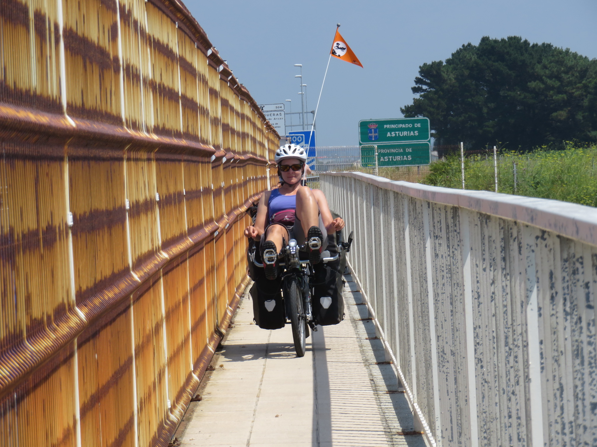 Nous continuons toujours à rouler sur les routes nationales, en général la N634. Elle est vraiment tranquille la plupart du temps, les peu de voitures qui passent nous laissent beaucoup d’espace – des fois même un peu trop, certains vont même jusqu’à emprunter la voie d’en face (de préférence juste avant un virage… les gens semblent se soucier plus de nous cyclistes que des voitures qui viennent en face). Sur notre application GPS nous avons enregistré le Camino pour vélos, qui évite parfois cette route. Cet après-midi nous décidons de suivre ce chemin pour voir, c’est peut-être joli… Il semble qu’en entrant en Asturias, nous avons déjà oublié notre aventure du Pays Basque. Ça monte presque immédiatement et tellement raide qu’on est de nouveau à la limite de la poussée ! Nous retournons vite à notre chère N634 et nous jurons de ne plus en dévier jusqu’à Santiago. Après cette petite piqûre de rappel nous nous arrêtons assez tôt dans notre premier camping « première classe ». Le prix aussi, il est « première classe »… Il y a une piscine, mais surprise il faut un bonnet de bain… mais cette fois nous avons vraiment envie de nous baigner parce qu’il fait chaud ! Alors on se bricole vite fait des « bonnets » avec nos Buffs (pour les non-initiés, un bout de tissu en forme de tube ou sorte de tour-de-cou), on a l’air vraiment cons mais on peut se baigner (en tout cas personne ne s’est plaint). Désolée, on n’a pas immortalisé ça en photo !