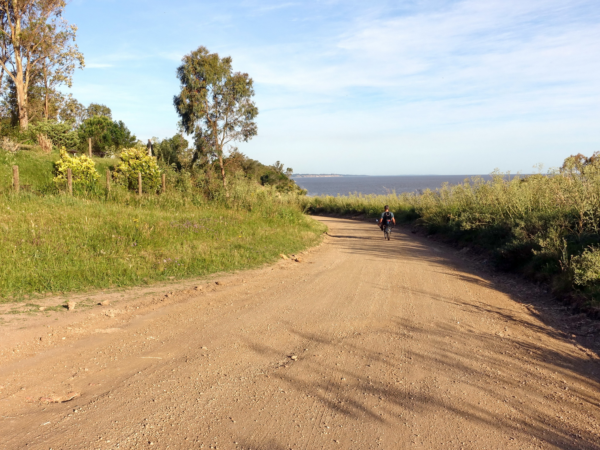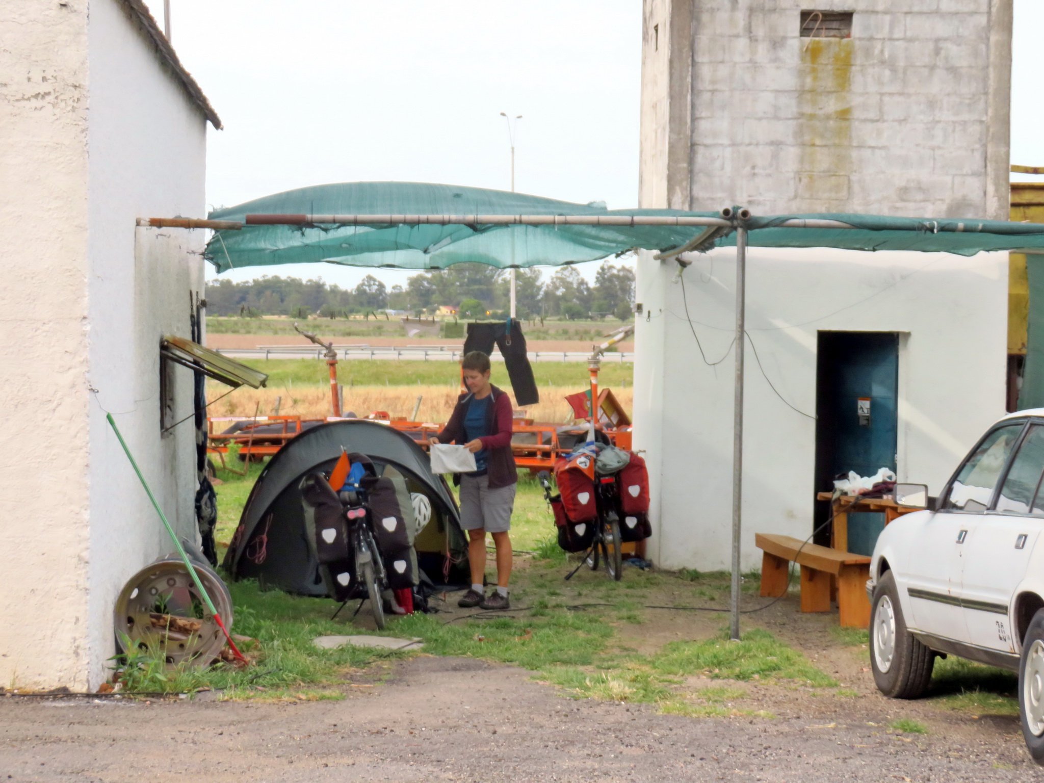En milieu d’après-midi nous arrivons à Libertad, une petite ville de province. Nous nous arrêtons pour une pause coca (oui j’avoue, on boit presque tous les jours du coca mais ça fait tellement du bien quand on fait du vélo…). Rapidement un homme attablé sur la terrasse du café commence à parler avec nous, puis il nous demande où nous allons dormir ce soir. Nous ne savons pas très bien, peut-être à côté d’une station-service 17 kilomètres plus loin. C’est là qu’il nous invite à venir planter la tente chez lui à côté de son garage. Il s’appelle Edgard et a aussi un profil sur Couchsurfing, et a déjà accueilli plusieurs fois des cyclistes. Il ne nous faut pas longtemps pour accepter, nous sommes fatigués et il fait chaud. Il nous invite donc de suivre sa vieille Peugot jusqu’à sa maison 2 km plus loin. Sa maison, c’est un garage avec un bureau et une pièce servant de cuisine et de chambre à coucher, au milieu d’une grande cour qui sert à entreposer des machines agricoles qu’il propose à la vente. Un petit local est aménagé en salle de bains simple, avec toilettes et douche (et un trou par lequel les eaux usées s’évacuent directement dans le jardin…). Le tout est gardé par quatre chiens sympathiques. Au milieu de tout ça, nous posons notre tente. Mais avant, nous chargeons nos vélos dans une camionnette et Edgard nous conduit à la plage au bord du Rio de la Plata, pour une petite promenade du soir pendant qu’il essaie de pêcher du poisson dans la rivière (sans succès). C’est un endroit tranquille et très beau, avec une belle vue sur la rivière qui ressemble à une mer.
