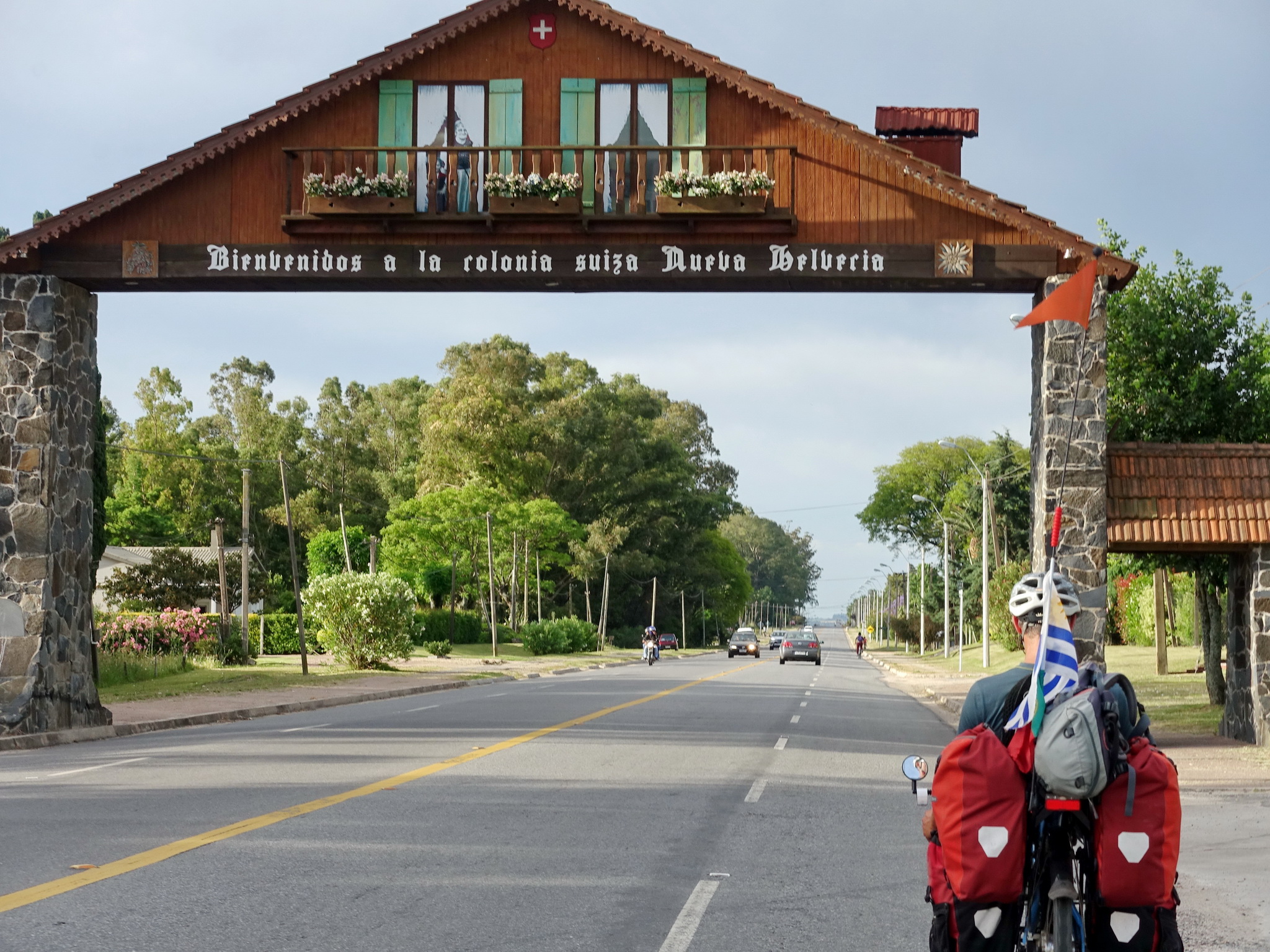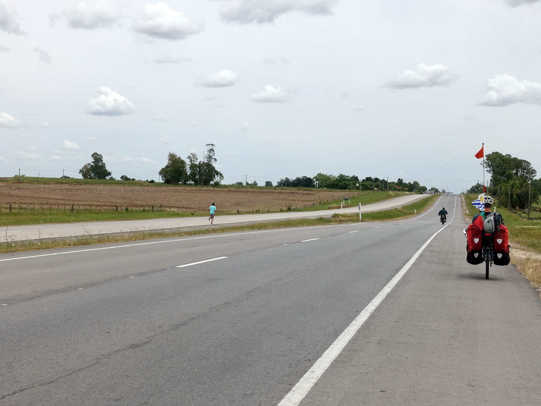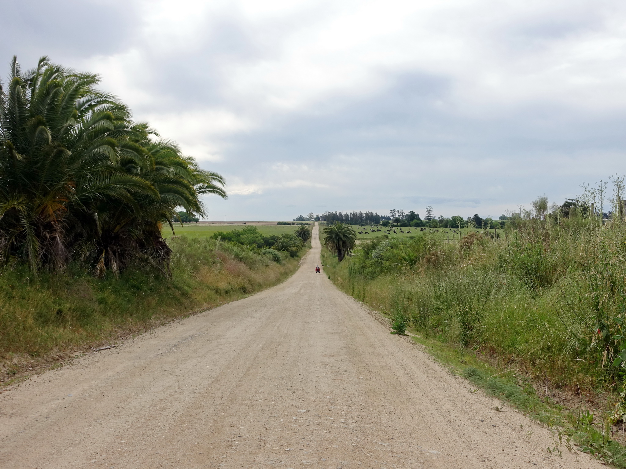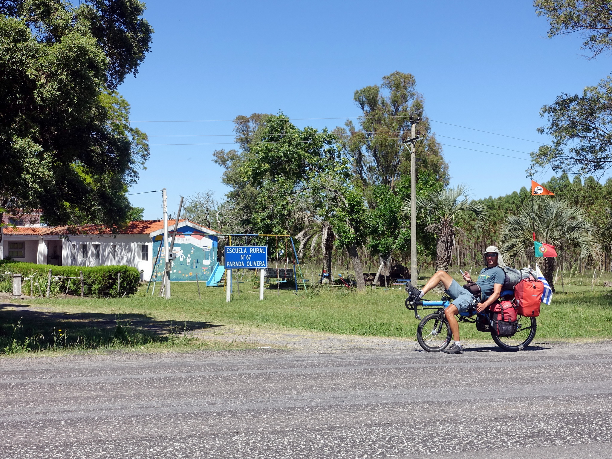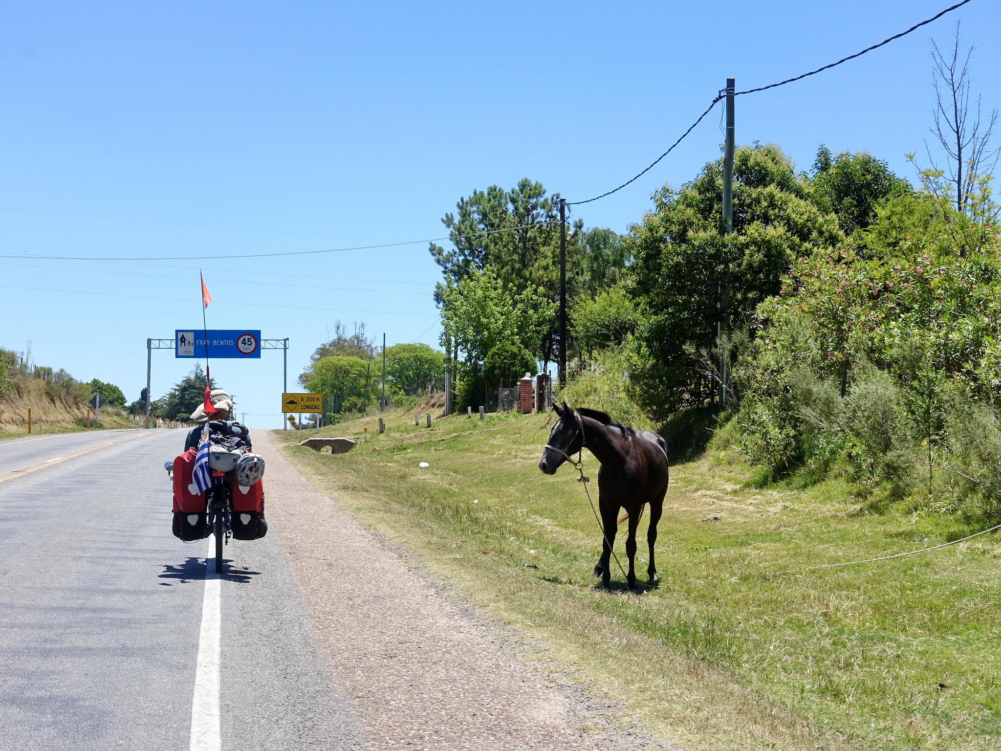 Nous repartons reposés pour un dernier tour en Uruguay, ce pays dont nous ne savions presque rien avant de venir. Nous quittons Montevideo sur une route très fréquentée, mais grâce à une bande d’arrêt d’urgence confortable et à nos rétroviseurs nous nous en sortons sans trop de stress et arrivons dans la campagne uruguayenne. Pas grand-chose de neuf ici, des champs à perte de vue traversés par notre route nationale 1. Au village de Santiago Vazquez nous nous trouvons une fois de plus en face d’un panneau d’interdiction pour vélos, placés sur la montée à un pont et à un endroit où il est trop tard pour faire demi-tour ou pour rejoindre une autre route…