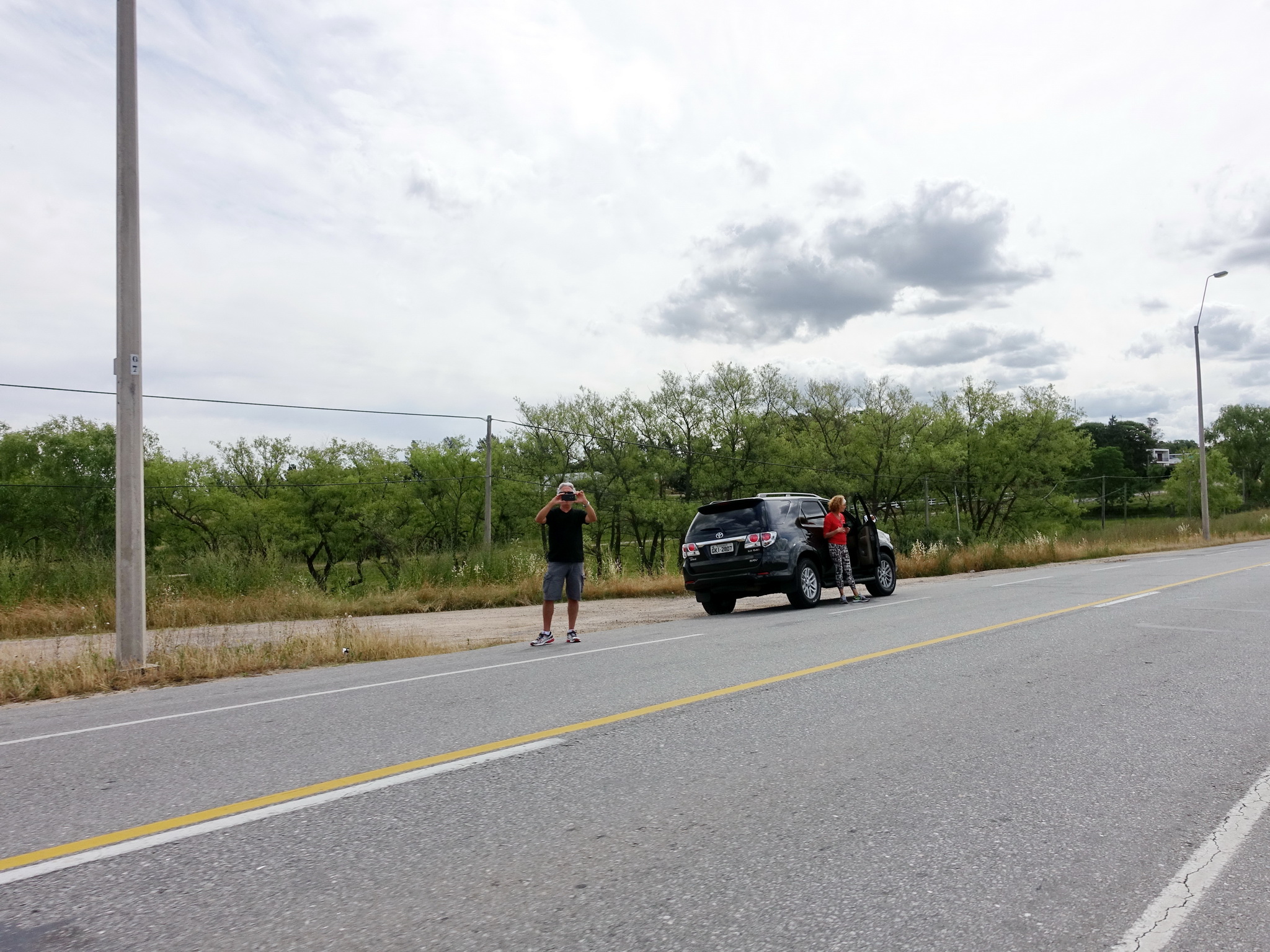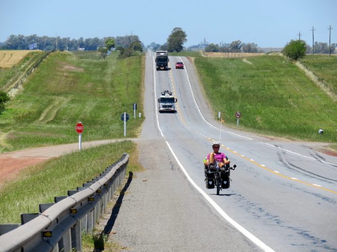 Notre routine de pédalage est interrompue par un couple brésilien qui nous prend en photo depuis leur voiture, puis s’arrête pour nous raconter qu’ils ont un ami qui construit des vélos couchés au Brésil. On parle un moment et on leur permet de prendre plein de photos de nos vélos et de nous, en demandant de nous les envoyer par e-mail. Malheureusement et comme souvent, nous n’avons finalement rien reçu de leur part…