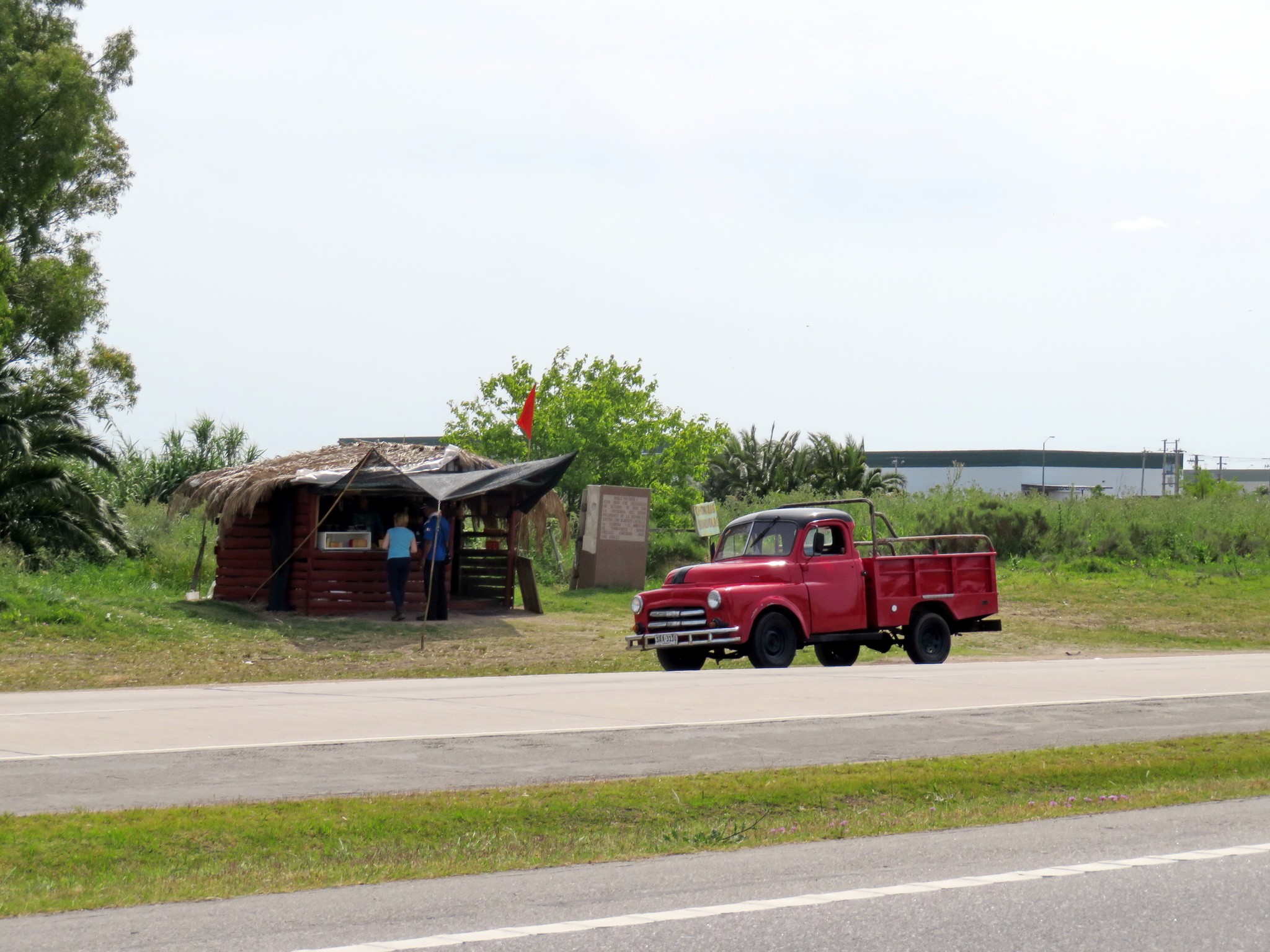 Le matin nous faisons notre petite routine en évitant le plus possible les sanitaires « muy limpios ». Avant de quitter la ville nous passons au supermarché (pour le pain) et à la station-service (pour les toilettes). La route jusqu’au prochain village (Nueva Palmira) est sans intérêt particulier, à défaut d’avoir quelque chose d’intéressant à voir pour les yeux on a le temps de penser à plein de choses (comme ce que je vais écrire dans ce blog, par exemple). Nous nous arrêtons pour le déjeuner à Nueva Palmira, on trouve une table sympa, ombragée sous des arbres et au bord de la rivière, mais quand je m’assieds un truc me pique – le lieu est envahi par des chenilles ! Comme je n’aime pas ce genre de petit animal (surtout quand ça fait mal) on reprend toutes nos affaires pour changer de lieu. On finit par trouver une table avec un peu moins de chenilles, mais il y en aura quand même une qui se laissera tomber de l’arbre – sur mon épaule ! On se réfugie sur nos vélos et reprend la route rapidement, jusqu’à la prochaine station-service où nous remplissons nos bouteilles d’eau et parlons un peu avec les trois employés.