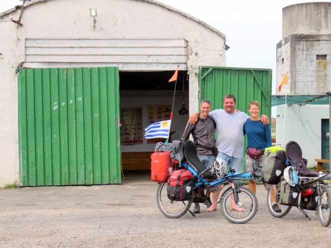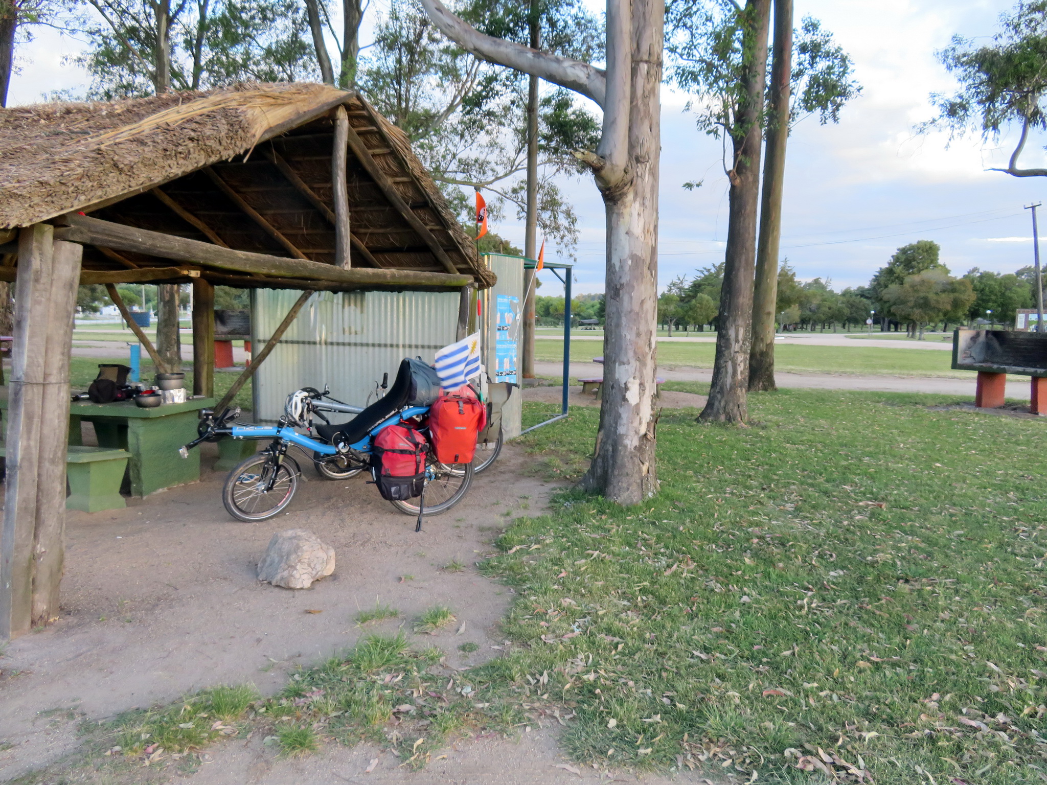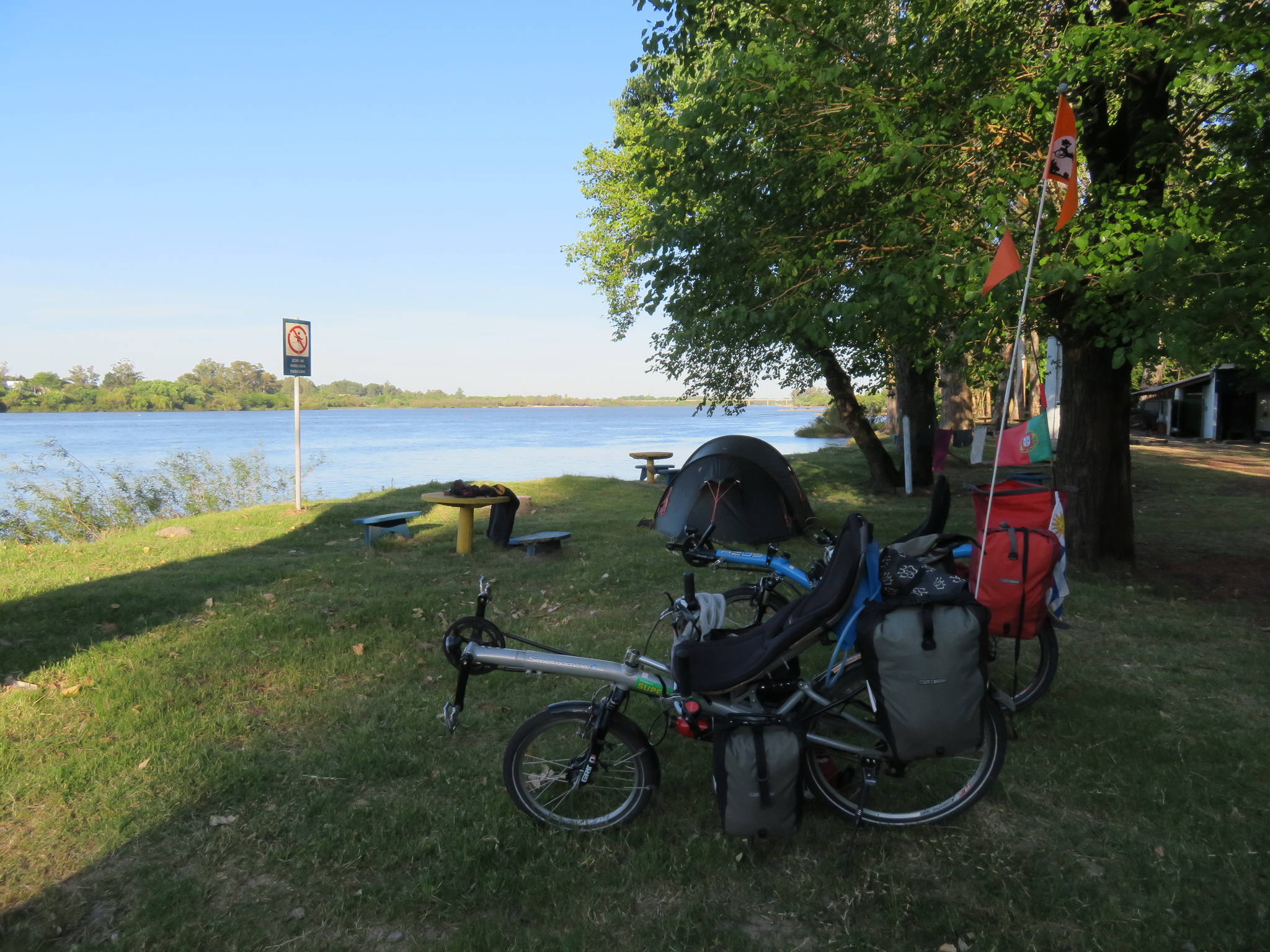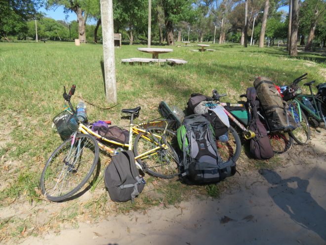 Le lendemain matin nous rencontrons brièvement 3 cyclo-voyageurs qui ont aussi passé la nuit au camping, un trio de musiciens du Chili et d’Allemagne voyageant avec leurs instruments sur des vélos assemblés à partir de pièces récupérées à Buenos Aires. Comme quoi, pas besoin de dépenser une fortune pour aller voyager à vélo ! Nous leur donnons quelques tuyaux pour la suite de leur route (ils vont remonter la côte vers le Brésil) avant de partir en direction de Fray Bentos, à la frontière avec l’Argentine.