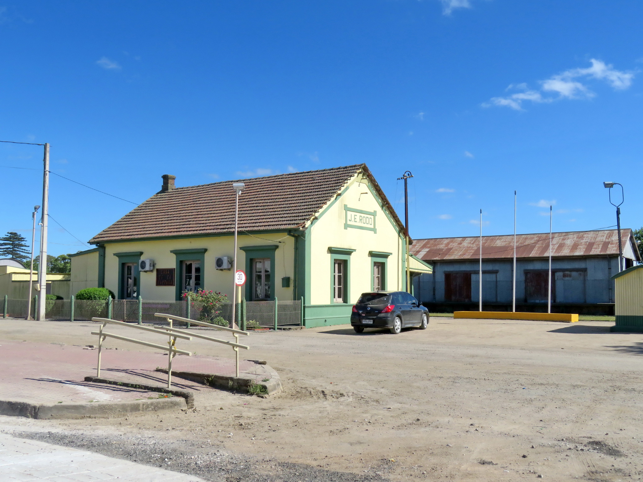 Le lendemain la route monte et descend sans arrêt. Elle ne monte jamais très haut (le point le plus haut se situe autour de 200 mètres) mais je la trouve fatigante toute de même – on fait une montée, mais en haut on n’a ni une belle vue, ni une belle descente… En plus il y a un vent froid, heureusement que nous l’avons dans le dos. A notre destination du jour, le village de José Enrique Rodo, nous nous arrêtons au grand parc municipal car nous avons lu qu’on pouvait y camper. Effectivement la gardienne du parc nous le confirme, nous pouvons camper dans le parc gratuitement, il y a des tables, de la lumière, de l’électricité et des toilettes, mais pas de douches. Nous partons découvrir le village et rencontrons une femme qui nous raconte que son fils est aussi en train de voyager à vélo en Amérique du Sud. Nous avons l’espoir secret qu’elle nous invitera prendre une douche chaude chez elle, mais on devra se contenter avec une photo qu’elle nous enverra par facebook…