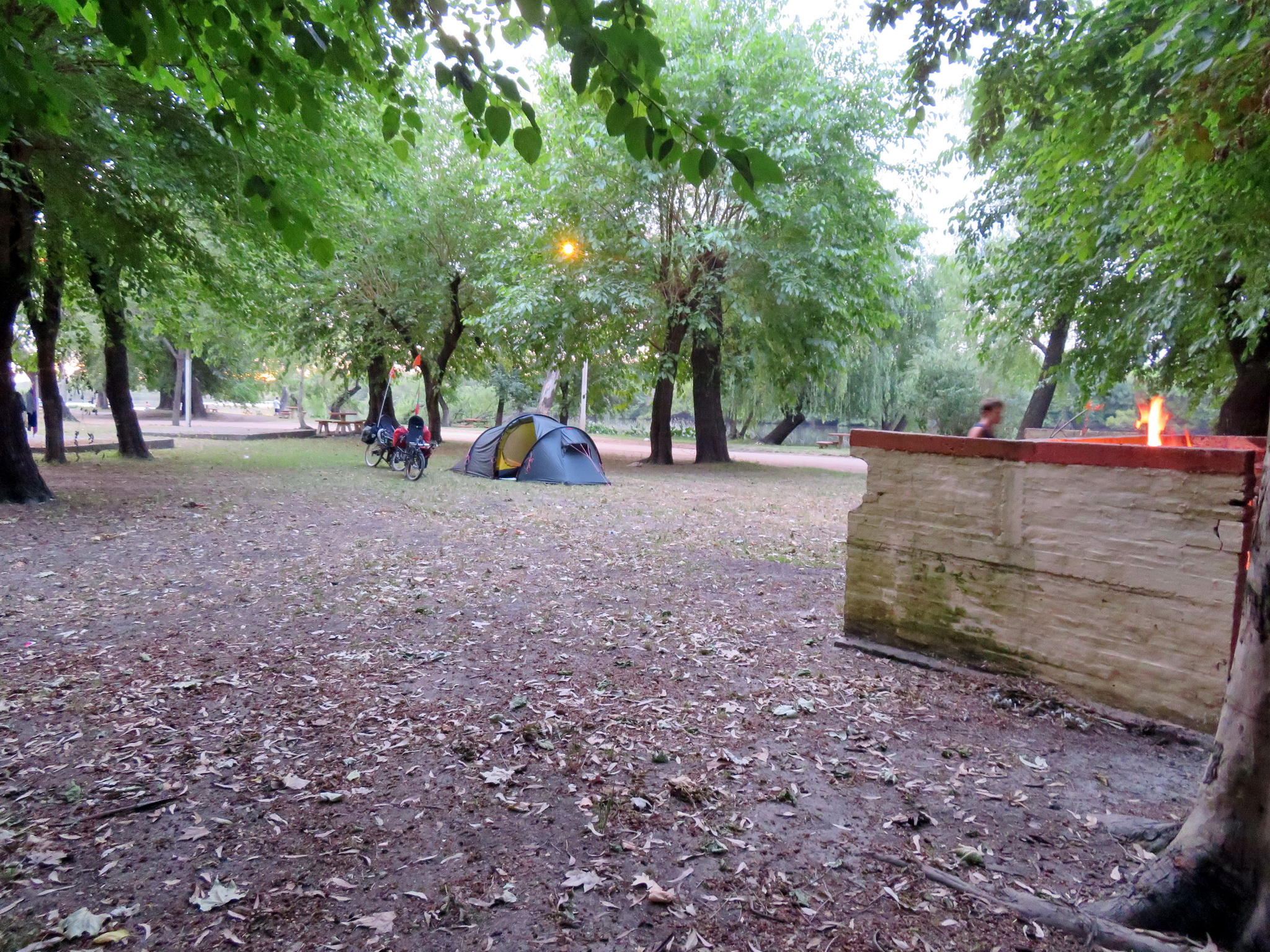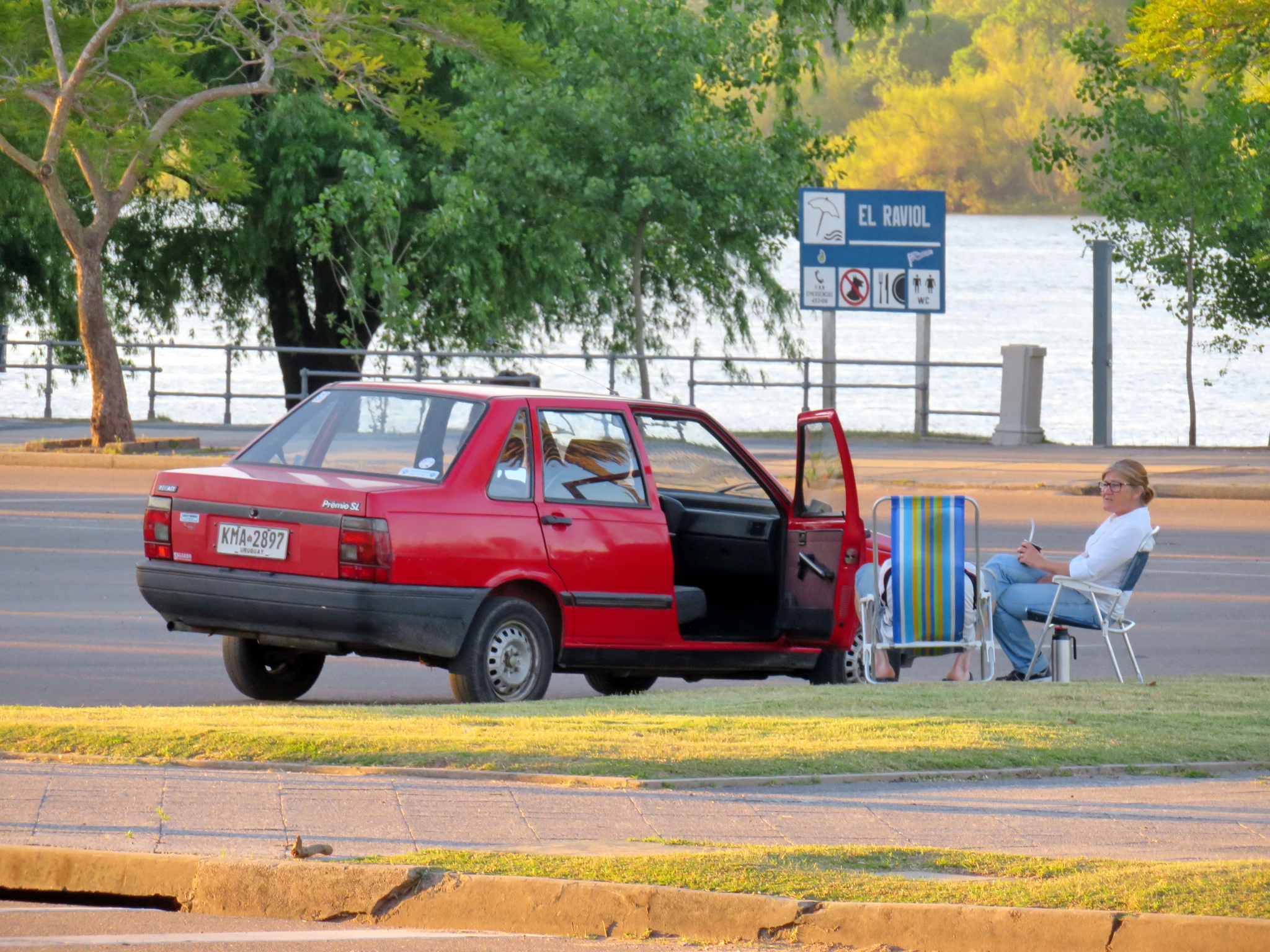 Nous passons voir le camping de la ville – « camping » est un grand mot, c’est en fait un coin du parc au bord de la rivière avec un panneau qui dit camping. Il y a des toilettes mais pas de douches… une famille y est installée depuis 2 mois (oui, oui, ils semblent habiter là) et la mère nous assure que c’est très tranquille et que les sanitaires sont « muy limpios ». On ne doit pas avoir le même concept de « limpio», car nous on les trouve franchement sales… Par contre l’endroit a effectivement l’air tranquille, et encouragés par notre succès à Mercedes nous nous rendons à l’office de tourisme pour demander où on pourrait prendre une douche chaude. Après deux téléphones c’est réglé : nous sommes envoyés au « stade » (la salle multisport) où un très gentil monsieur nous attend, nous ouvre les vestiaires et allume l’eau chaude. Il nous propose même de revenir y dormir s’il devait commencer à pleuvoir ce soir (ce qui ne sera pas le cas, malgré le ciel bien chargé en nuages). Nous retournons alors au camping et passons la soirée à essayer de griller des saucisses avec le peu de bois qu’on arrive à trouver dans le parc. Autour de nous, les gens viennent se « promener » en voiture ou en moto, ça semble être le passe-temps préféré le soir. Heureusement que les Uruguayens ne sont pas des grands fêtards, au grand maximum ils se posent un moment pour boire le maté, mais ne font aucun bruit. Cela fait un peu bizarre de camper au milieu de tout ça, mais ça semble être la chose la plus normale du monde et nous passons donc une nuit calme.