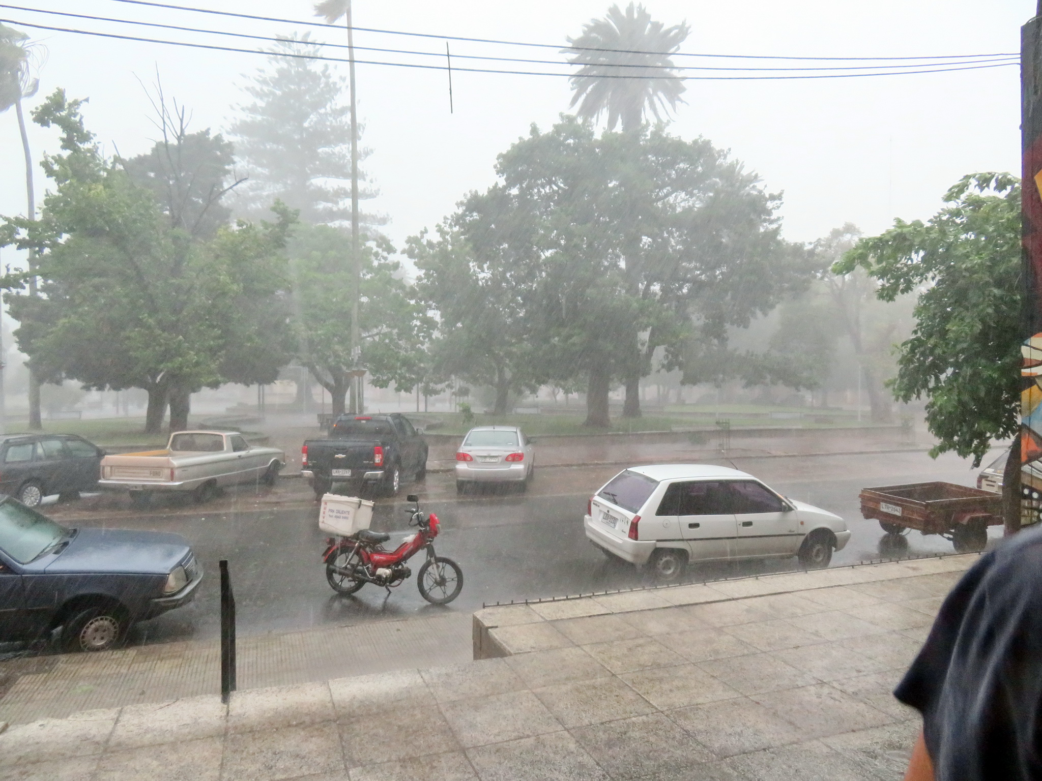 Nous passons un jour de repos à Carmelo avant de prendre le bateau pour Buenos Aires. Nous faisons un tour en ville, puis allons déjeuner dans un café. Peu de temps après, la tempête éclate. Il pleut des cordes, il y a du vent, des coups de tonnerre. Nous restons un bon moment au café, contents d’avoir renoncé au camping ! De retour dans notre chambre d’hôtel, l’eau rentre par la fenêtre et le plafond, la table est inondée (nos billets de bateau ont été épargnés comme par miracle), il y a une énorme flaque d’eau par terre. Le gérant de l’hôtel nous envoie « la muchacha » pour nettoyer (qui est en fait un homme), et en début de soirée la pluie cesse et la chambre sèche rapidement. Nous pouvons alors sortir pour notre dernier dîner uruguayen – pour une fois ce ne sera pas un asado, mais du rôti de porc et des pâtes fraiches faites maison.