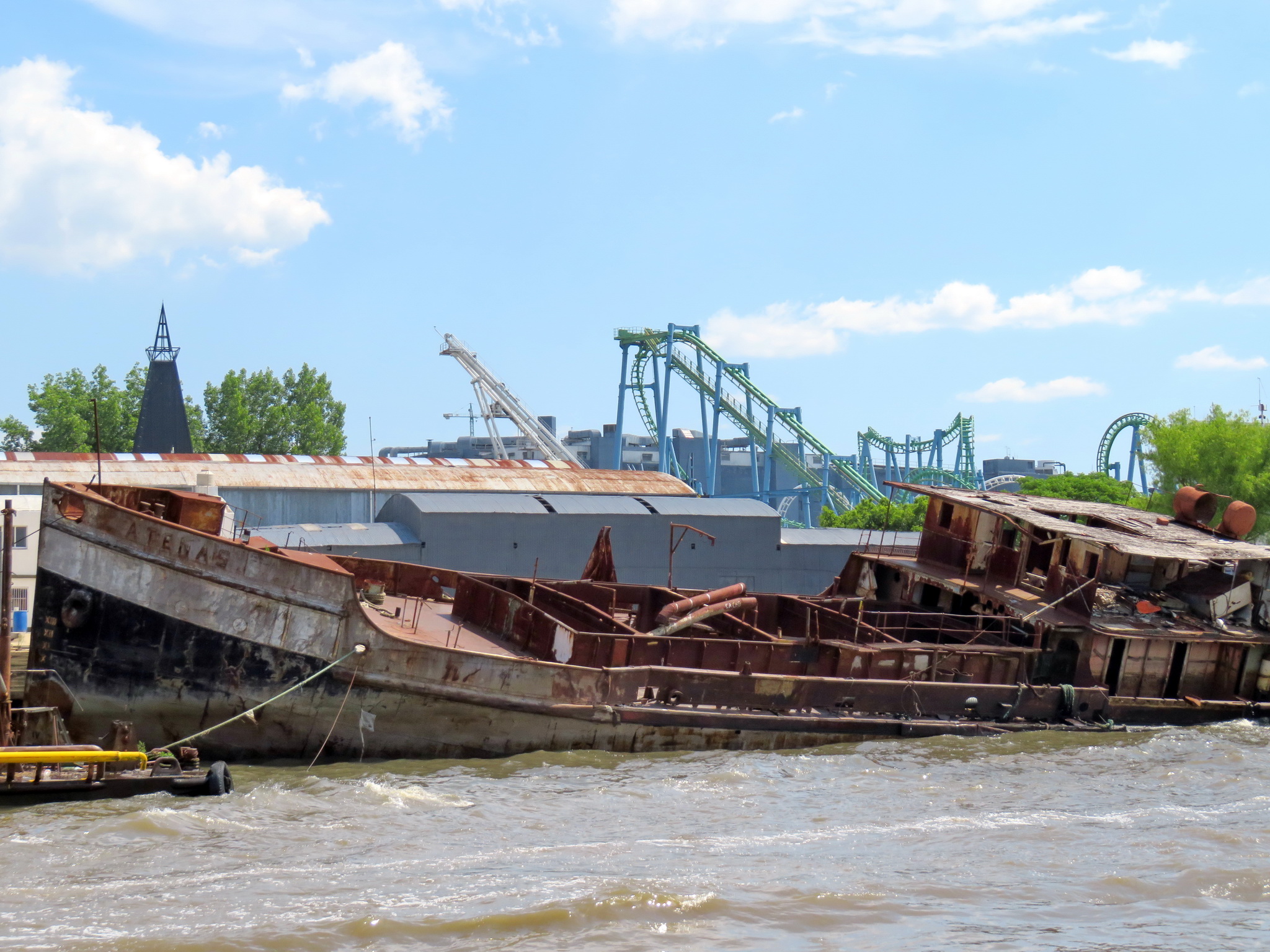 Le parc d’attractions moderne, à côté d’anciens bateaux en train de couler dans la rivière…
