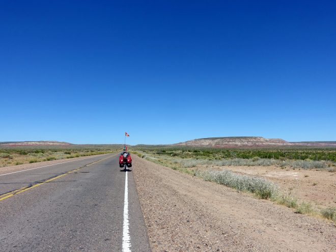 Quand elle s’arrête brusquement au niveau de l’aéroport de Zapala (qui n’a probablement jamais été en fonction), nous roulons enfin sur la fameuse Ruta 40 qui traverse l’Argentine du sud au nord. Elle est effectivement beaucoup plus calme, et même si elle traverse une région assez aride et pauvre en eau, elle est beaucoup plus intéressante que ce qu’on a fait jusqu’à maintenant. Il y a des vraies montées (les jambes le ressentent vite…) et des vraies descentes (pur plaisir). On traverse ce qui ressemble à un très ancien cratère de volcan, on reconnaît encore d’anciennes cheminées ayant transporté de la lave il y a bien longtemps.