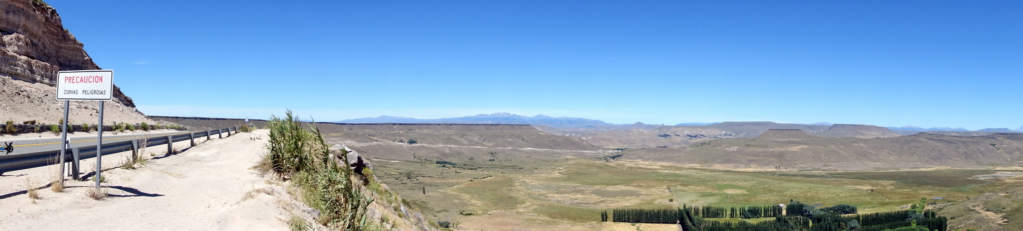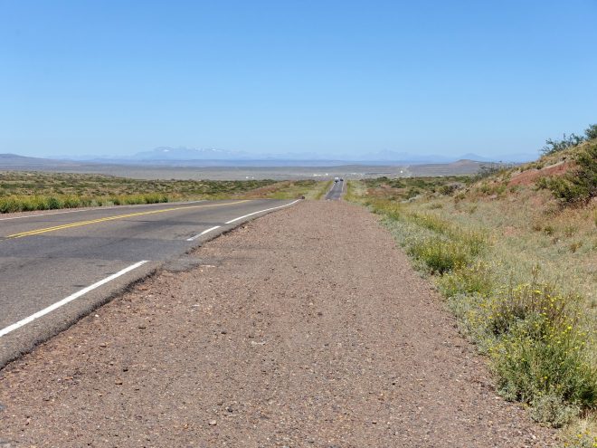 La route qui sort de Neuquén en direction de Bariloche est en travaux, il semble y avoir un grand projet d’élargissement de la route mais qui ne semble pas avancer depuis plusieurs mois. Tant mieux pour nous, car il y a une voie parallèle à la route, parfaitement asphaltée, mais inutilisée. Nous avons donc une sorte de piste cyclable géante rien que pour nous, sauf pour passer les ponts et les villages, où cette nouvelle voie est interrompue.