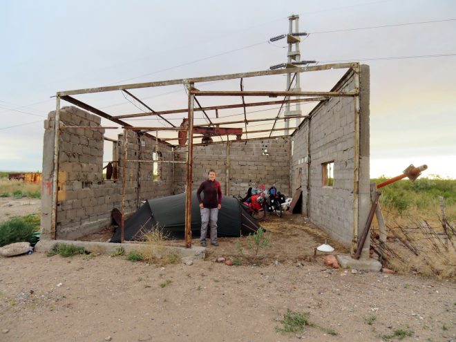Nous y voyons tout de suite un possible lieu pour camper. Nous allons parler avec la famille qui tient le petit magasin: un monsieur qui n’a presque plus de dents, sa femme et leurs trois enfants (le lendemain un quatrième apparaîtra). Des gens très simples mais d’une énorme gentillesse. Pour eux il est plus que naturel de nous laisser camper derrière leur maison. On plante notre tente entre les trois murs d’une maison à moitié détruite, ça ne sonne pas très glamour mais en fait il y a un sol en terre parfait pour planter les sardines, et nous sommes protégés du vent et de la vue des passants. Il y a même un vieux frigo par terre que nous utilisons comme table. Les enfants du couple viennent nous poser plein de questions et nous leur montrerons quelques photos d’Europe.