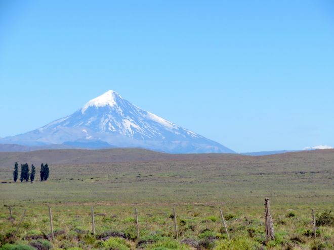 Il commence tout de même à faire chaud, et on traverse une région sans arbres où la seule ombre que nous trouvons pour manger est un abribus. On sent que cette étape va être dure… Après une dernière montée, il nous reste 20 kilomètres à faire en descente, malheureusement avec du vent de face et un très mauvais asphalte qui freine beaucoup. Nous sommes déjà très fatigués, quand là, de très loin, apparaît une pyramide blanche. Le volcan Lanín !