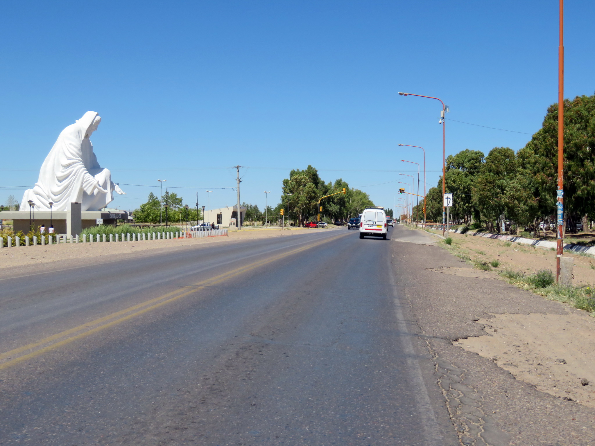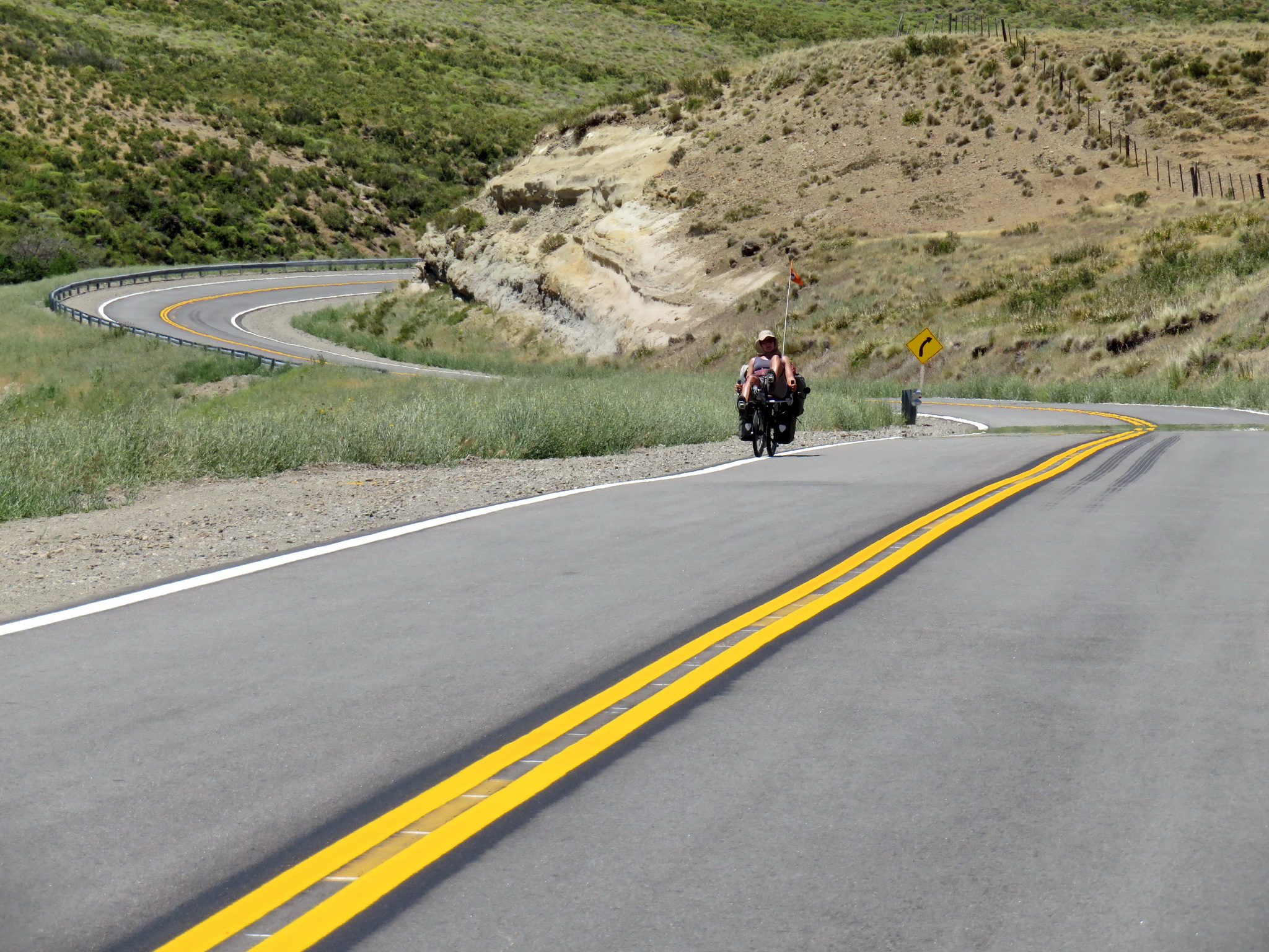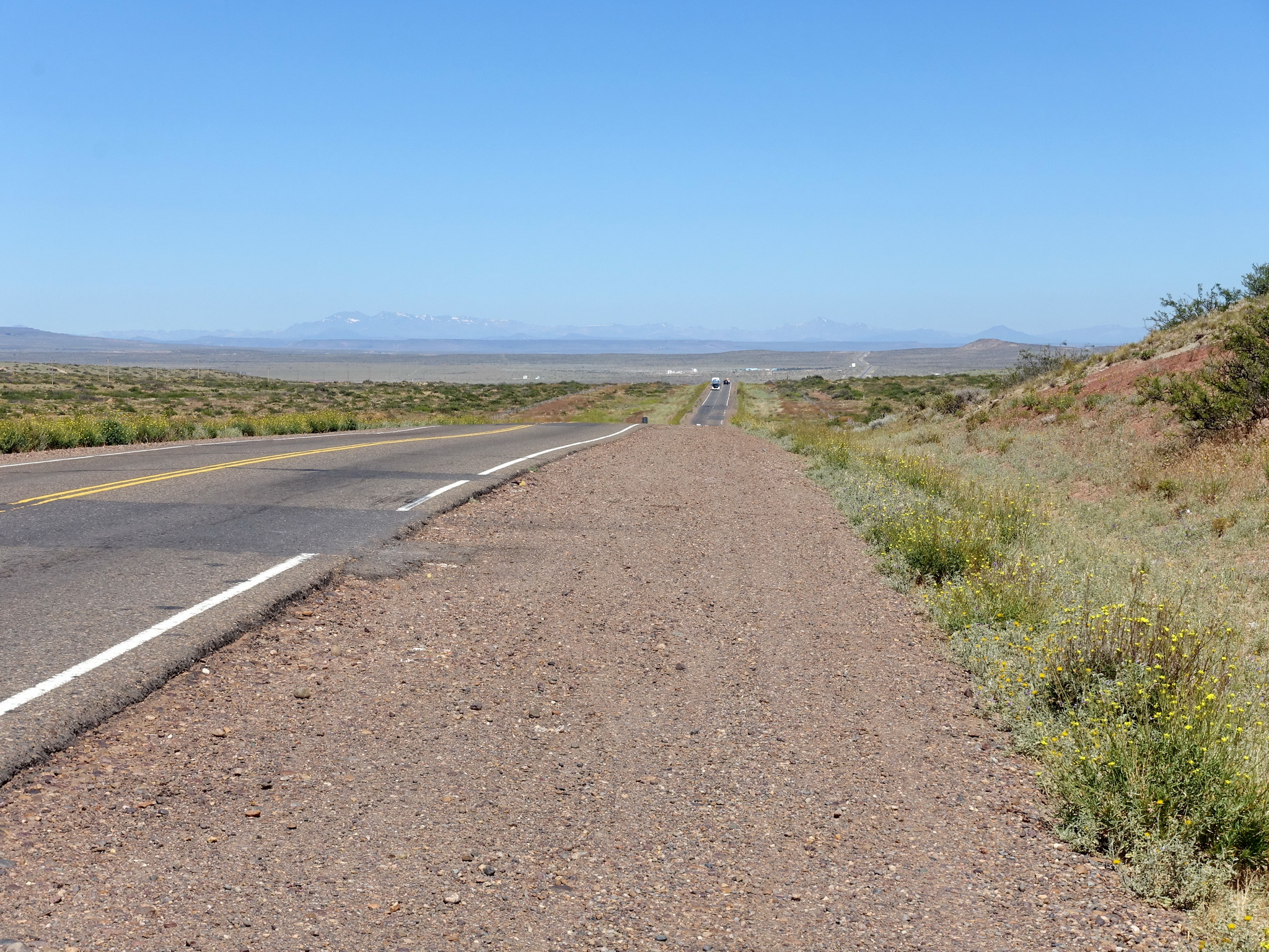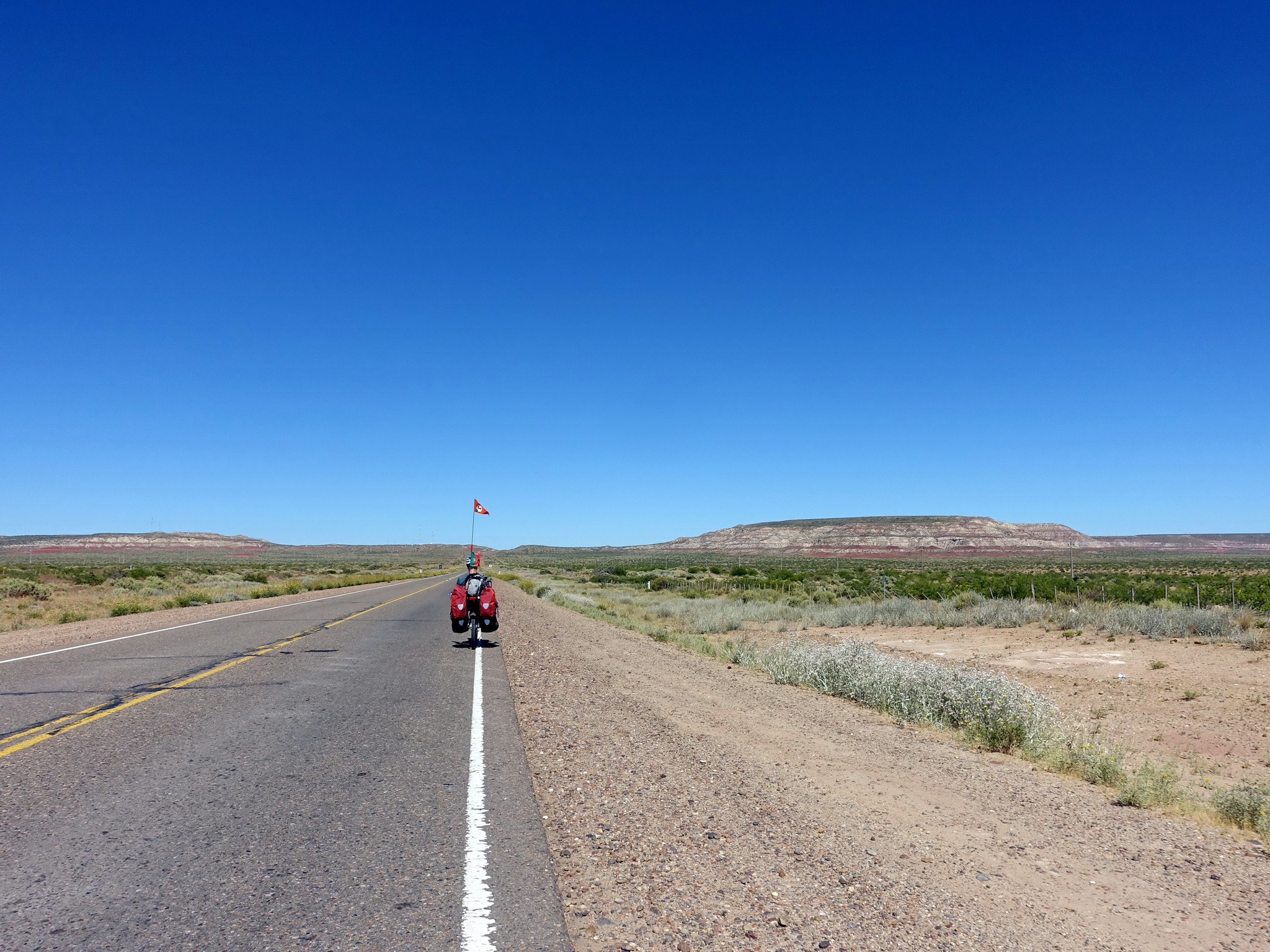 La route qui sort de Neuquén en direction de Bariloche est en travaux, il semble y avoir un grand projet d’élargissement de la route mais qui ne semble pas avancer depuis plusieurs mois. Tant mieux pour nous, car il y a une voie parallèle à la route, parfaitement asphaltée, mais inutilisée. Nous avons donc une sorte de piste cyclable géante rien que pour nous, sauf pour passer les ponts et les villages, où cette nouvelle voie est interrompue.