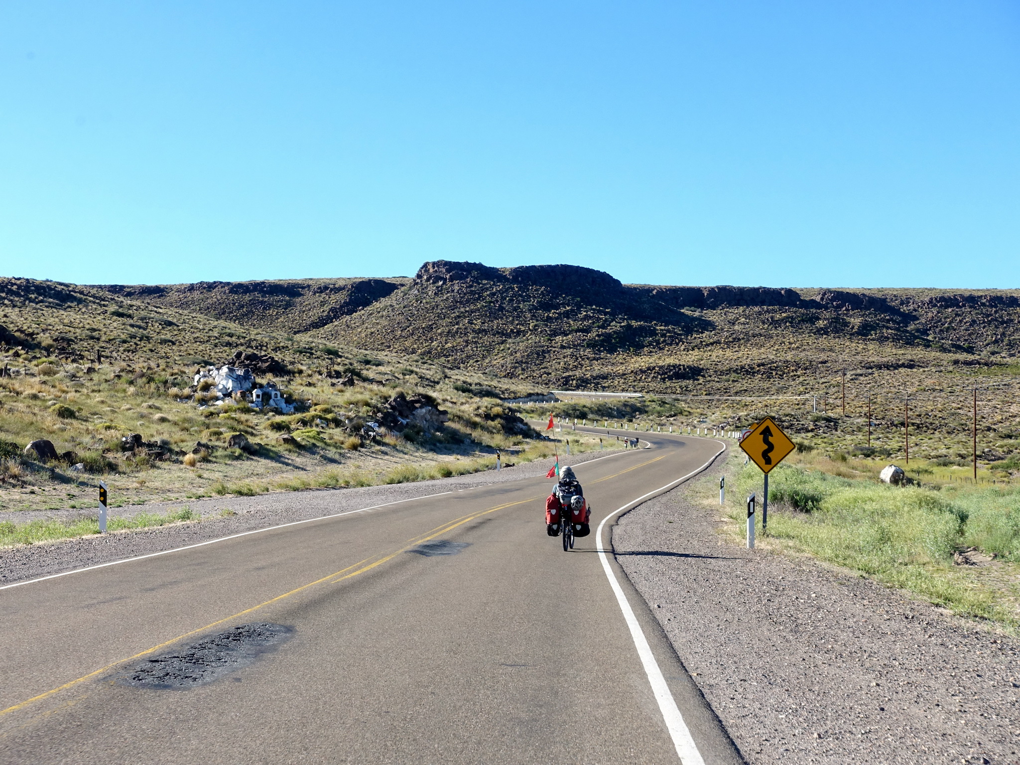 Nous prenons la route qui bifurque vers Zapala, accompagnés de nombreuses voitures. Nous regrettons déjà nos routes désertiques de la pampa. Les argentins sont tous très gentils et sympathiques, sauf quand ils se trouvent derrière le volant. De nouveau, on pédale avec un œil constamment dans le rétroviseur. De nombreuses fois on doit s’échapper sur la bande d’arrêt d’urgence, qui est faite de sable, de cailloux et d’herbe. Inimaginable pour un argentin de ralentir à cause d’un vélo. On a l’impression qu’ils préfèrent prendre le risque de nous tuer plutôt que d’utiliser leur frein (par ailleurs, c’est la même chose pour les piétons). C’est une route éprouvante car il faut se concentrer constamment. On a peu de temps de regarder le paysage. On se demande aussi constamment où on va pouvoir planter notre tente…