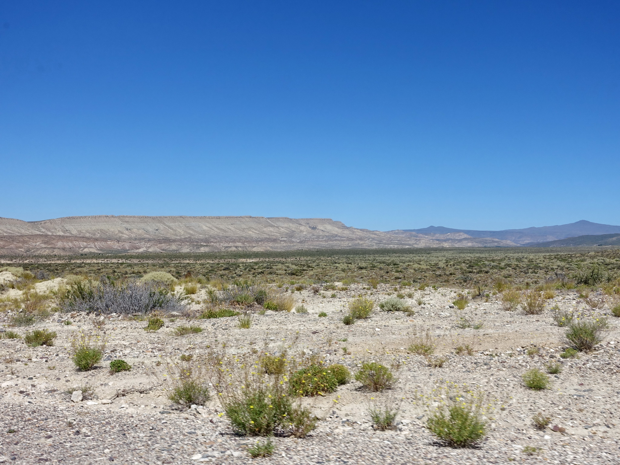 Le lendemain nous nous levons tôt, nous avons encore une longue étape en vue. Les montagnes et leurs lacs et rivières sont proches, mais avant il faut encore traverser une région très aride. En étudiant l’image satellite nous avons identifié un endroit pour passer la nuit, au bord d’une rivière, mais il faut faire 130 kilomètre pour arriver là. Au moment du départ le gérant de l’hôtel nous offre un sachet avec des croissants. Il nous rassure en disant que la route sera beaucoup plus tranquille qu’avant, mais il nous promet aussi que c’est « tout de la descente »… ce qui n’est pas possible car le point d’arrivée est à peu près à la même altitude que Zapala, et en plus nous avons analysé le dénivelé et nous savons qu’il y aura quelques bonnes montées à maîtriser.