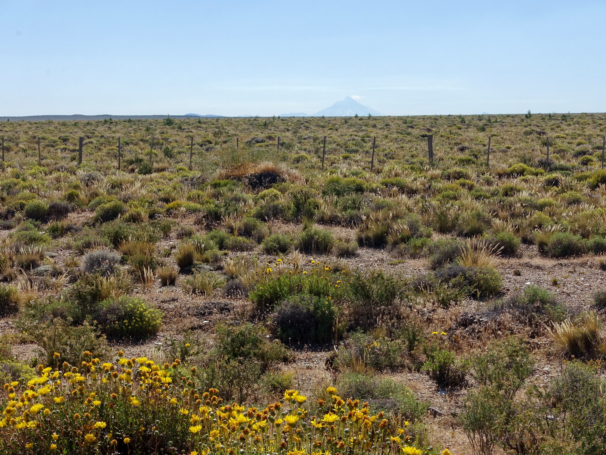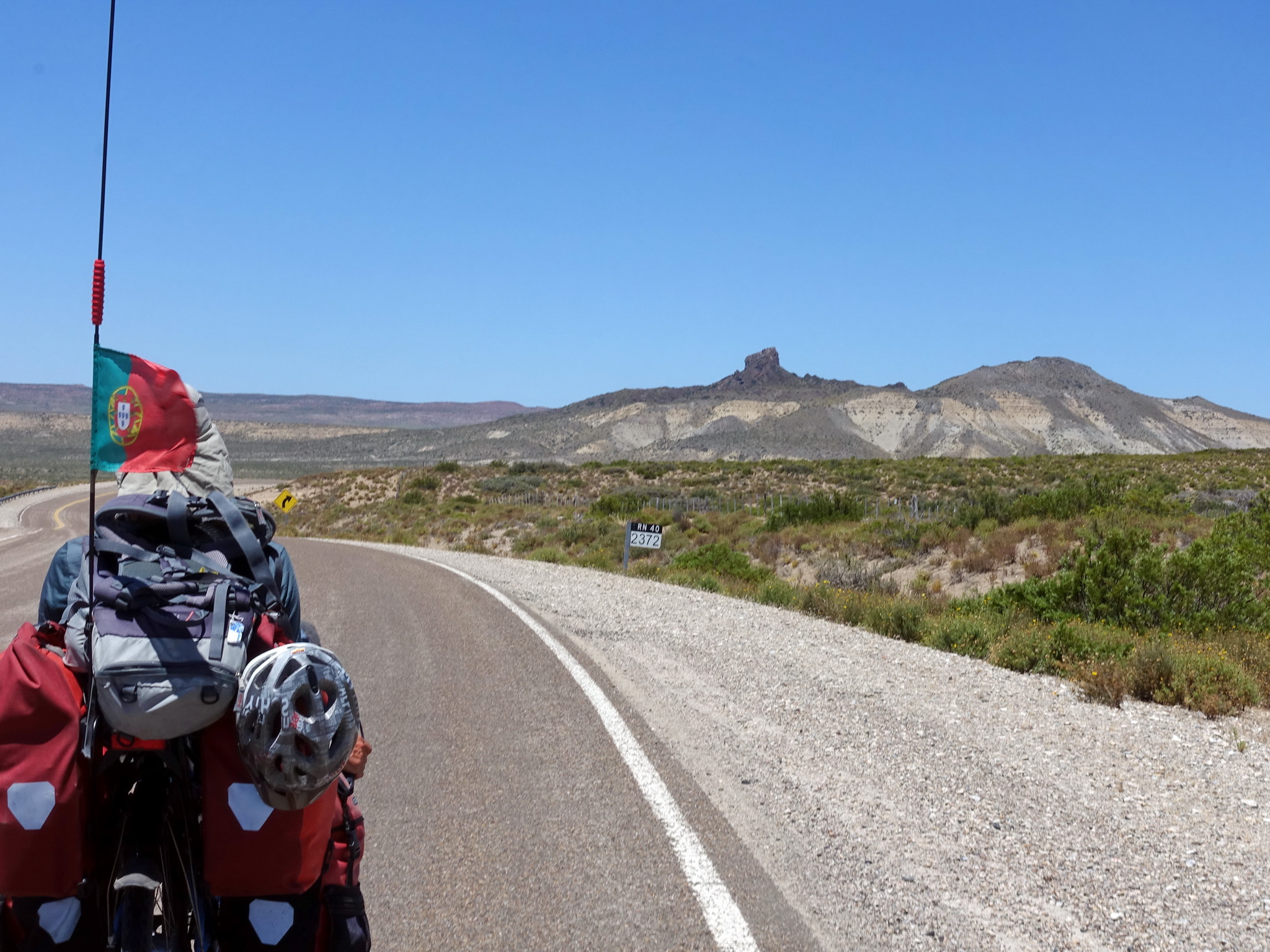 Il commence tout de même à faire chaud, et on traverse une région sans arbres où la seule ombre que nous trouvons pour manger est un abribus. On sent que cette étape va être dure… Après une dernière montée, il nous reste 20 kilomètres à faire en descente, malheureusement avec du vent de face et un très mauvais asphalte qui freine beaucoup. Nous sommes déjà très fatigués, quand là, de très loin, apparaît une pyramide blanche. Le volcan Lanín !