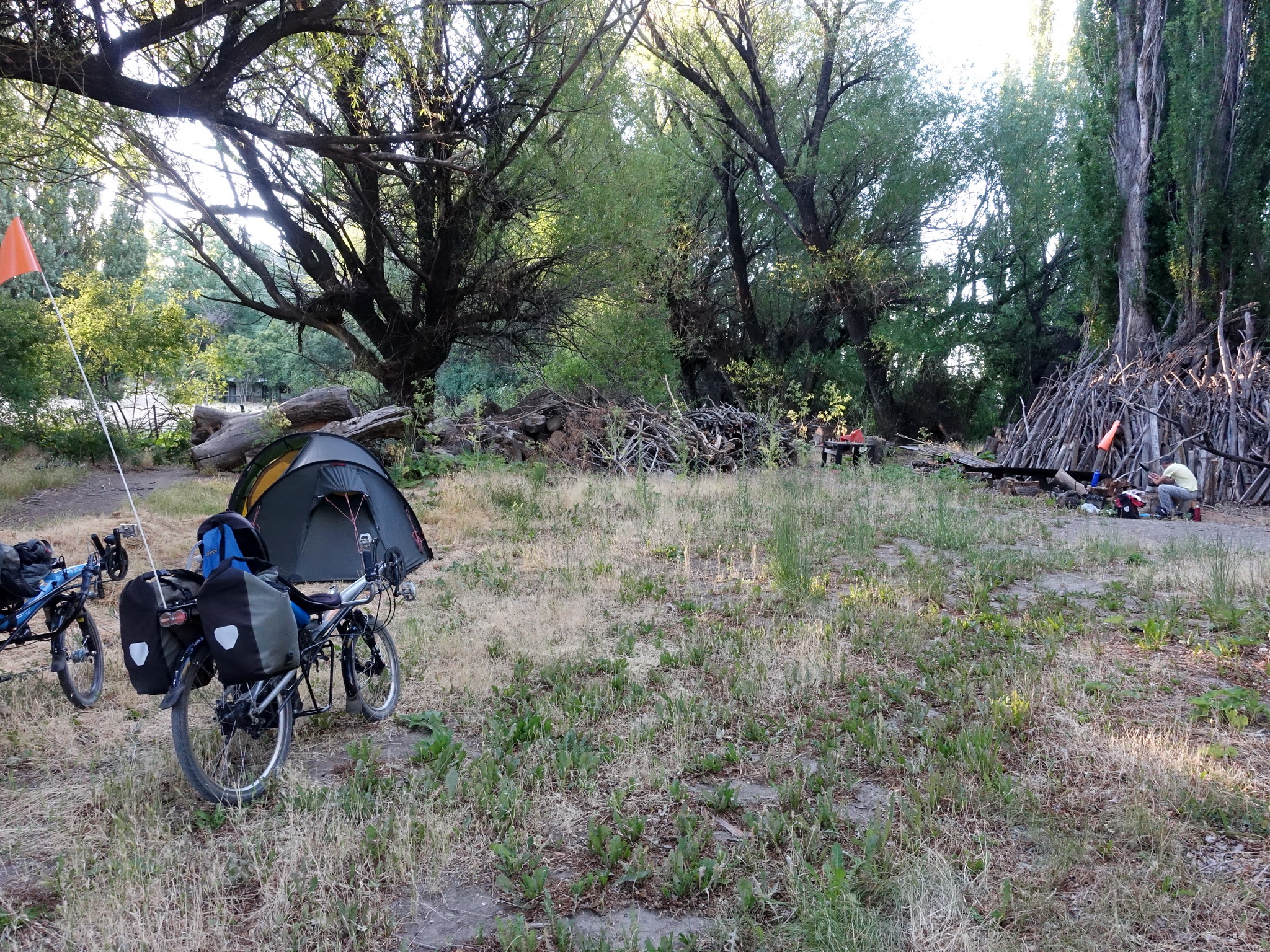 Nous arrivons épuisés au bord de la rivière Catán Lil, au bout de ce qui a probablement été l’étape la plus fatigante de tout le voyage. Mais mauvaise nouvelle, la rivière semble inaccessible. On voit des endroits qui seraient sympas pour camper au bord de l’eau, mais les quelques accès sont fermés. Nous décidons donc de nous diriger vers une maison, entourée d’arbres et où il y a des chevaux. Après quelque temps le propriétaire des lieux apparaît, il confirme que l’accès à la rivière n’est pas possible car c’est tout du terrain privé, par contre il nous invite à camper à côté de sa maison et à utiliser un robinet d’eau dans la cour. Il nettoie même un peu de terrain pour nous. Ce qu’ils sont sympathiques ces Argentins (quand ils ne sont pas derrière le volant…)!