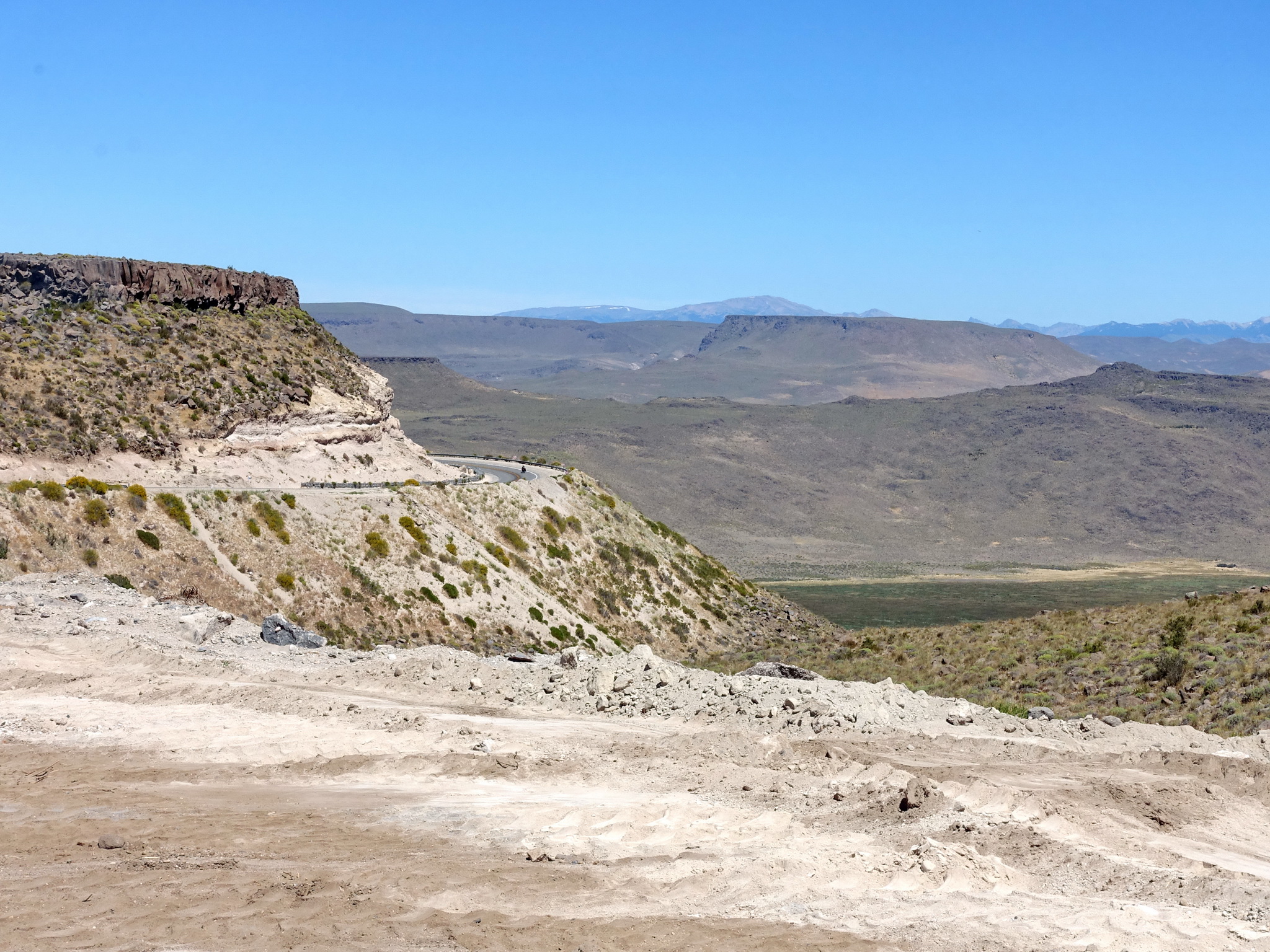 Quand elle s’arrête brusquement au niveau de l’aéroport de Zapala (qui n’a probablement jamais été en fonction), nous roulons enfin sur la fameuse Ruta 40 qui traverse l’Argentine du sud au nord. Elle est effectivement beaucoup plus calme, et même si elle traverse une région assez aride et pauvre en eau, elle est beaucoup plus intéressante que ce qu’on a fait jusqu’à maintenant. Il y a des vraies montées (les jambes le ressentent vite…) et des vraies descentes (pur plaisir). On traverse ce qui ressemble à un très ancien cratère de volcan, on reconnaît encore d’anciennes cheminées ayant transporté de la lave il y a bien longtemps.