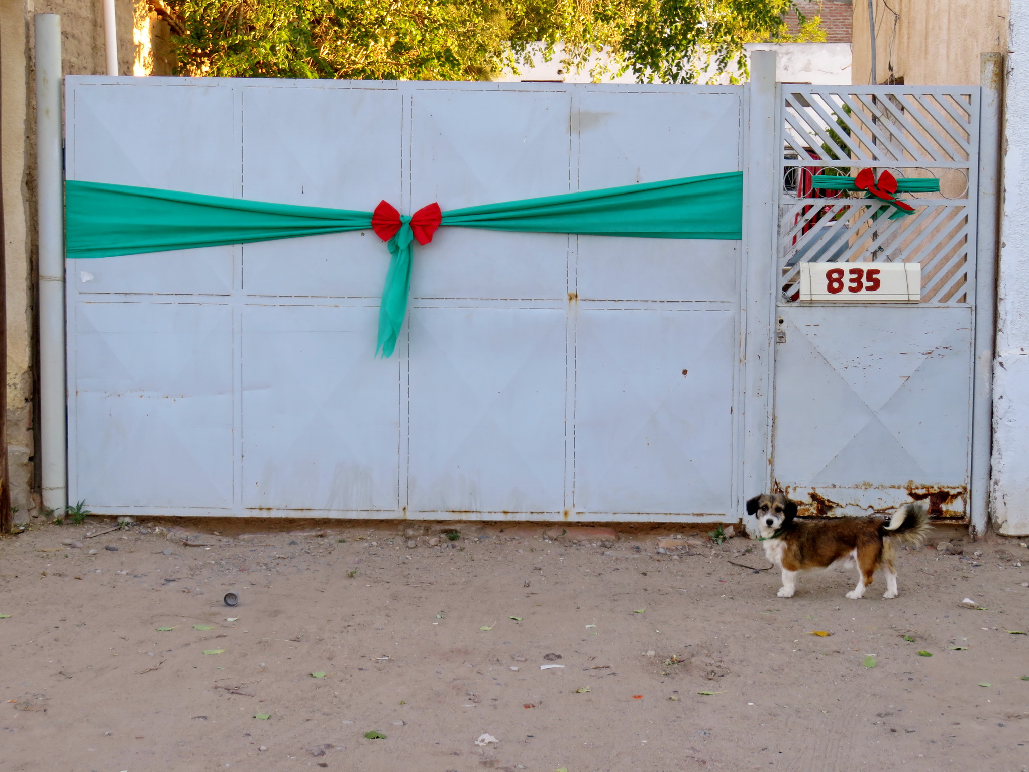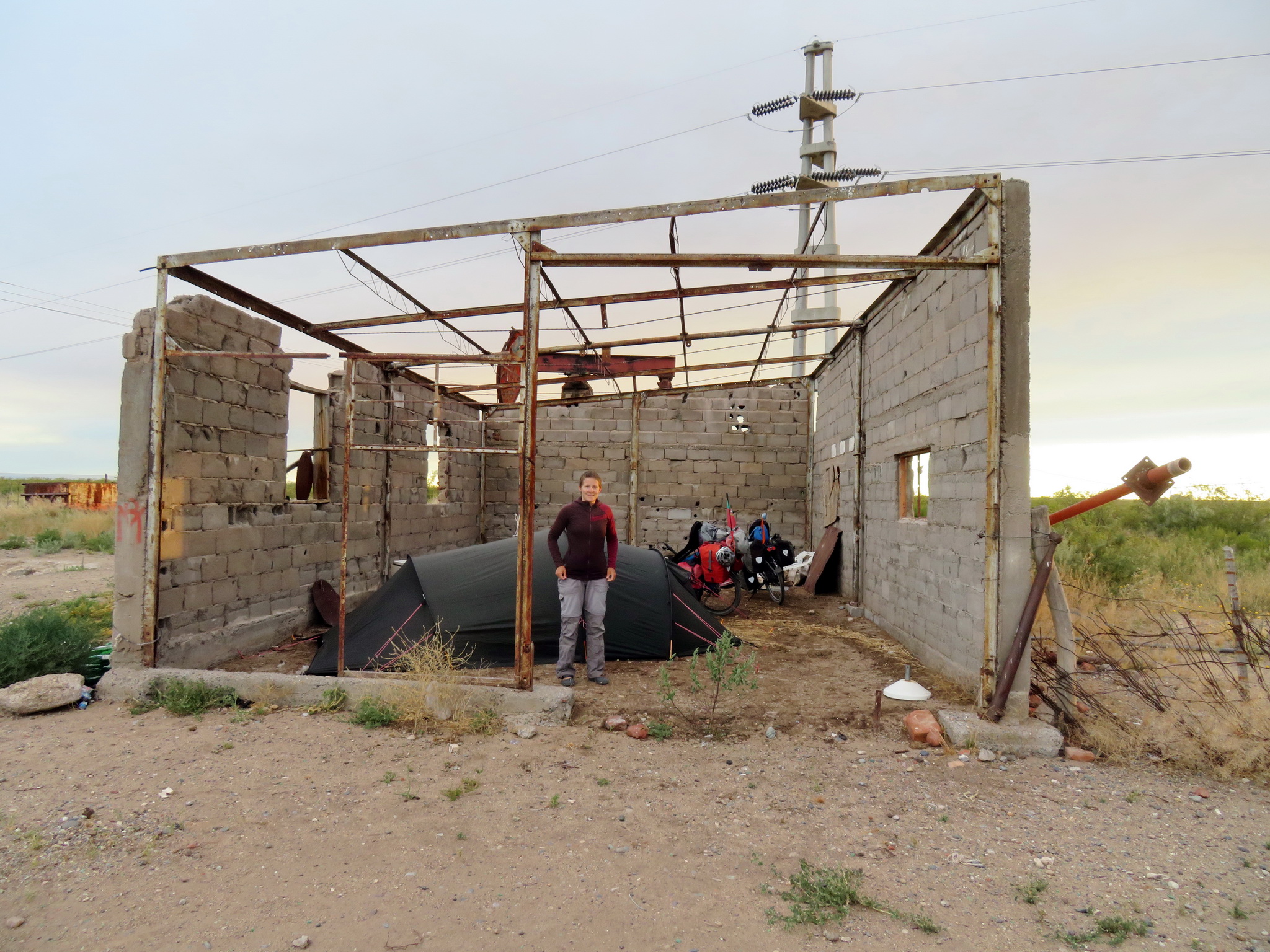 Vers midi le vent de face devient de plus en plus violent, il nous couvre de poussière et nous fait ralentir à 8 km/h. Nous arrivons à Arroyito, petit village en bord de rivière où nous espérons trouver un peu d’abri. Mais il n’y a pas grand-chose : une station-service mais sans café, un hôtel fermé pour les fêtes, un bord de rivière où tous les endroits abrités du vent sont déjà pris d’assaut par des familles… Il nous reste un petit restaurant, miraculeusement ouvert ce jour de Noël, où nous passons l’après-midi. Nous sommes vite rejoints par un chauffeur de camion colombien, il est content d’avoir un peu de compagnie et nous parlons avec lui et oublions le temps. Quand nous regardons dehors, le vent s’est calmé et il est déjà presque 18 heures. Que faire? Nous savons que la route à venir compte beaucoup de circulation de camions. Malgré l’heure déjà avancée, nous décidons donc de continuer pour faire un bout de cette route encore aujourd’hui. Nous verrons bien où nous allons dormir…
