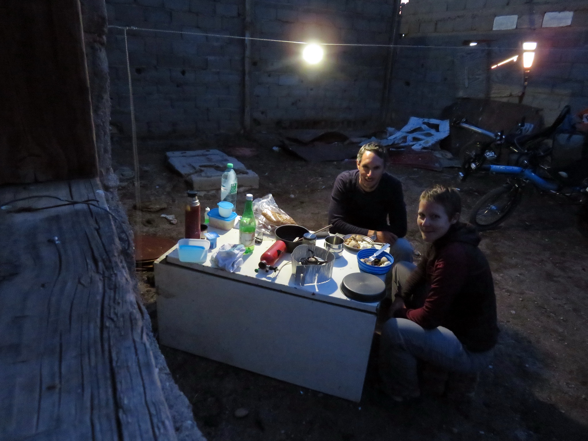 Nous y voyons tout de suite un possible lieu pour camper. Nous allons parler avec la famille qui tient le petit magasin: un monsieur qui n’a presque plus de dents, sa femme et leurs trois enfants (le lendemain un quatrième apparaîtra). Des gens très simples mais d’une énorme gentillesse. Pour eux il est plus que naturel de nous laisser camper derrière leur maison. On plante notre tente entre les trois murs d’une maison à moitié détruite, ça ne sonne pas très glamour mais en fait il y a un sol en terre parfait pour planter les sardines, et nous sommes protégés du vent et de la vue des passants. Il y a même un vieux frigo par terre que nous utilisons comme table. Les enfants du couple viennent nous poser plein de questions et nous leur montrerons quelques photos d’Europe.