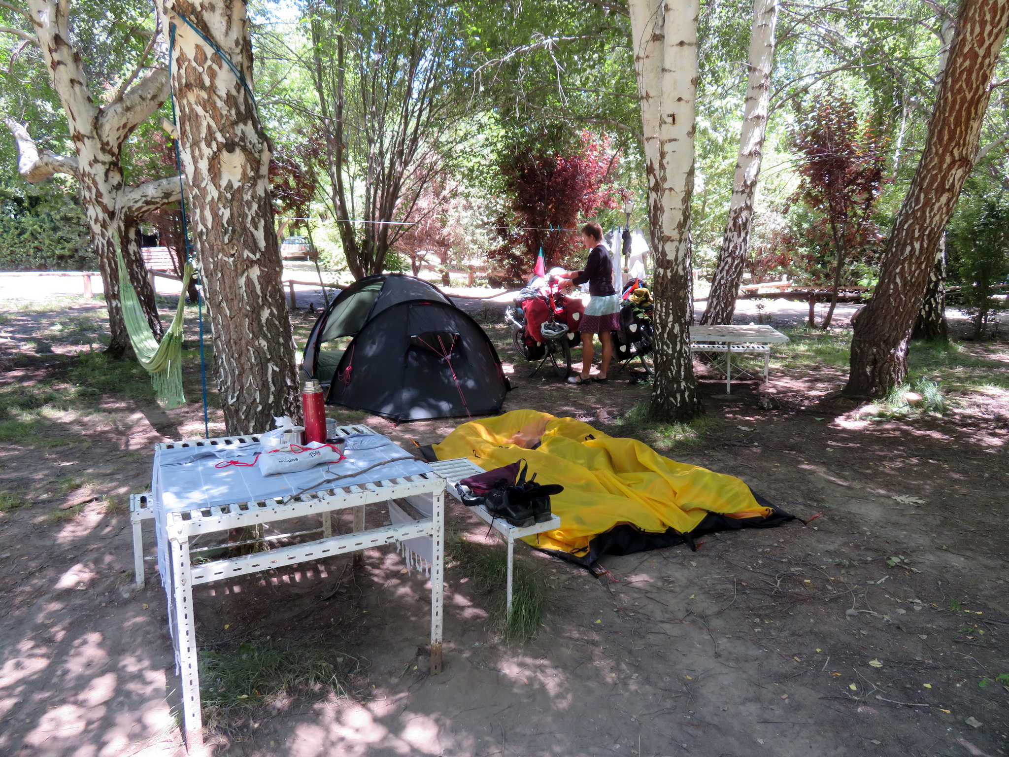 Une dernière descente nous amène à Junín de los Andes, un village assez touristique avec plein de logements, mais d’une taille encore humaine. Sur conseil de nos hôtes Juan et Norma, nous nous installons au camping Laura Vicuña au bord de la rivière. Comme tout dans cette région, il coûte un peu cher, mais il y a au moins des bonnes douches d’eau chaude – nous en serons contents, car les jours suivants la température baissera. Nous y passons trois jours à nous reposer, à laver la tente (c’était pour rien, le vent l’a tout de suite de nouveau recouverte de poussière), à faire la lessive, et à cuisiner de bonnes choses.