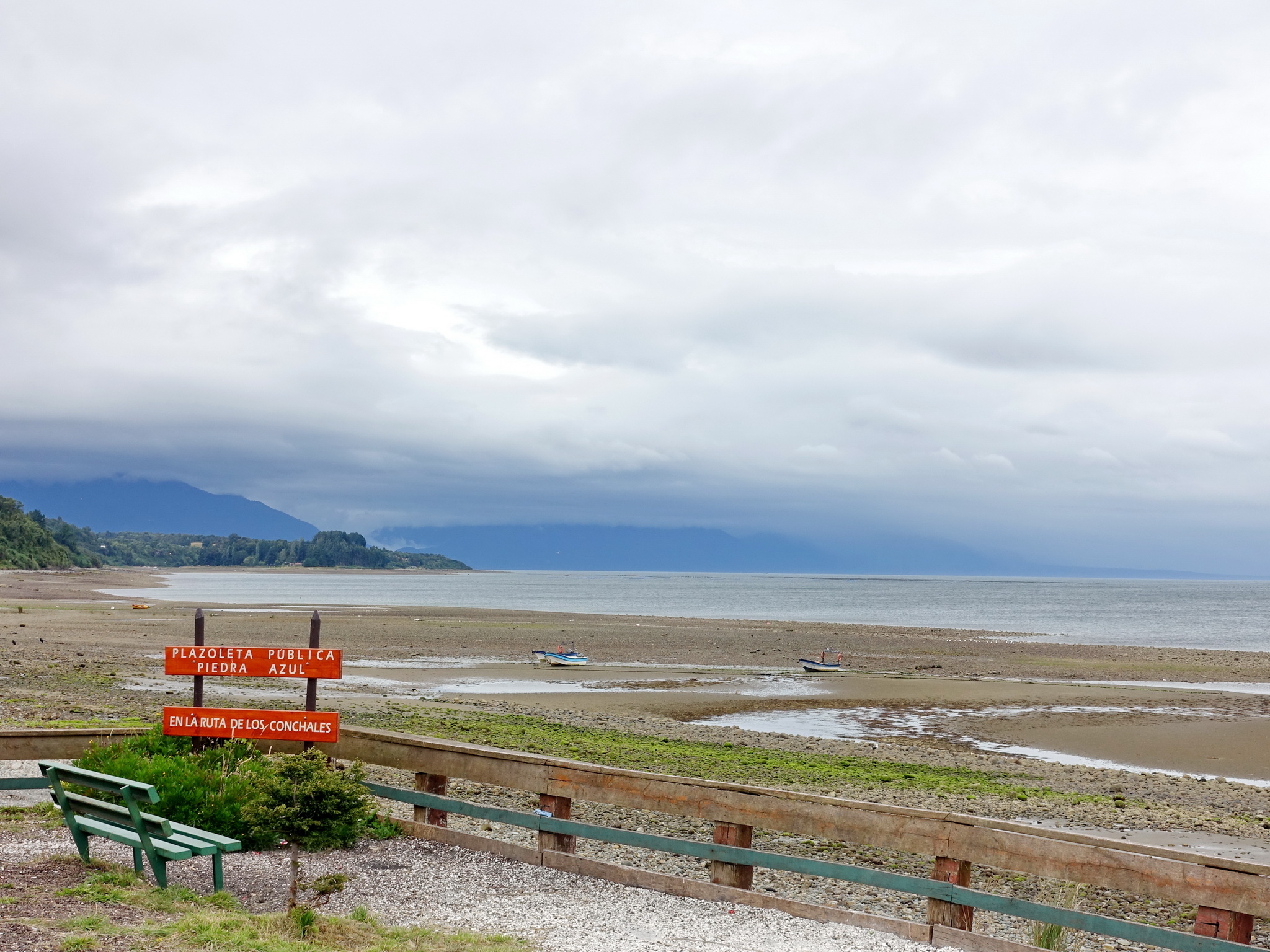 We left Puerto Varas in the direction of Puerto Montt, choosing the V-505 road (as opposed to the bigger road 5). It was a Sunday morning, and the road was reasonably quiet until just before Puerto Montt, where a bike path started. We then took a very steep road down to the shopping mall Paseo Costanera, which has a couple of outdoor stores. We didn’t find any more interesting things in Puerto Montt, but we ended up staying there for one night because one of our bags got stolen there (see the section about dangers below). On the next day we took road 7, better known as the Carretera Austral, which officially starts in Puerto Montt. Getting out of the city included climbing a hill in the company of quite some traffic, but once we were back down by the coast again we started enjoying it. We crossed simple villages, which had small shops and cafés and a few nice places to stop and enjoy the view.