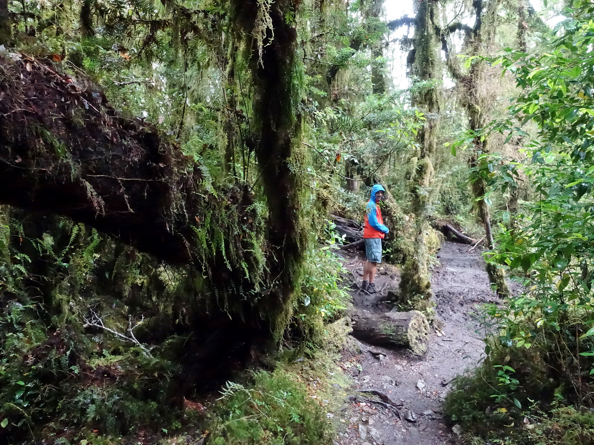 After this hot soak, we cycled another few kilometres until the next camp site (Las Toninas), which was a bit crowded but fine for one night. The next morning, we pedalled into Queulat National Park, where we paid the foreigners’ entrance fee and left our bicycles next to the ranger’s chalet. Despite the cloudy sky, we decided to hike the longest trail to the glacier viewpoint, which took us about an hour on a very muddy path. The weather got worse, and at the viewpoint we couldn’t see more than the lower part of a waterfall and lots of clouds. We waited some time there, but things just got worse, so we went back down.