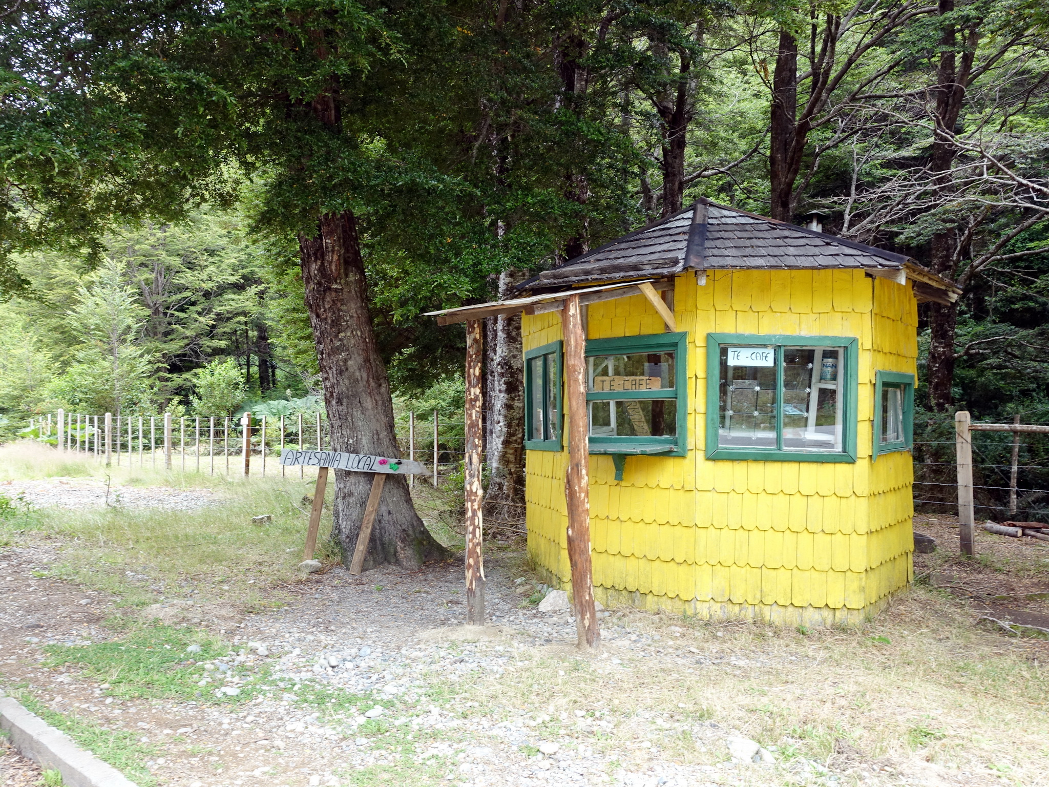 Villages often have one or several small shops selling food and all kinds of other things. The selection can be very small though, sometimes limited to sodas, chips and sweets. Despite of this, these shops are usually called “supermercado”. Empanadas and bread are often sold in these shops, too, or from private homes (look out for signs in the window). There is a very small choice of bread, usually small white bread rolls, and the quality is often low (but you can also stumble upon some surprisingly good homemade bread, although wholemeal bread is very rare). “Real” supermarkets are only to be found in bigger towns. We only encountered big, good quality supermarkets in Puerto Montt and Puerto Varas. Restaurants are on the expensive side for what they serve. They usually have a very small choice of fish (salmon and hake, plus some shellfish), and rarely other types of Chilean dishes. Cafés are all over the place, ranging from hip places geared towards tourists, to a corner inside a shop. Coffee is usually the instant version (Nescafé), except in more expensive places catering to tourists, where you can find espresso and caffé latte. Cakes are a common sight, they are called by their German name “Kuchen” in Chile. “Lemon Pai” is another common sweet.