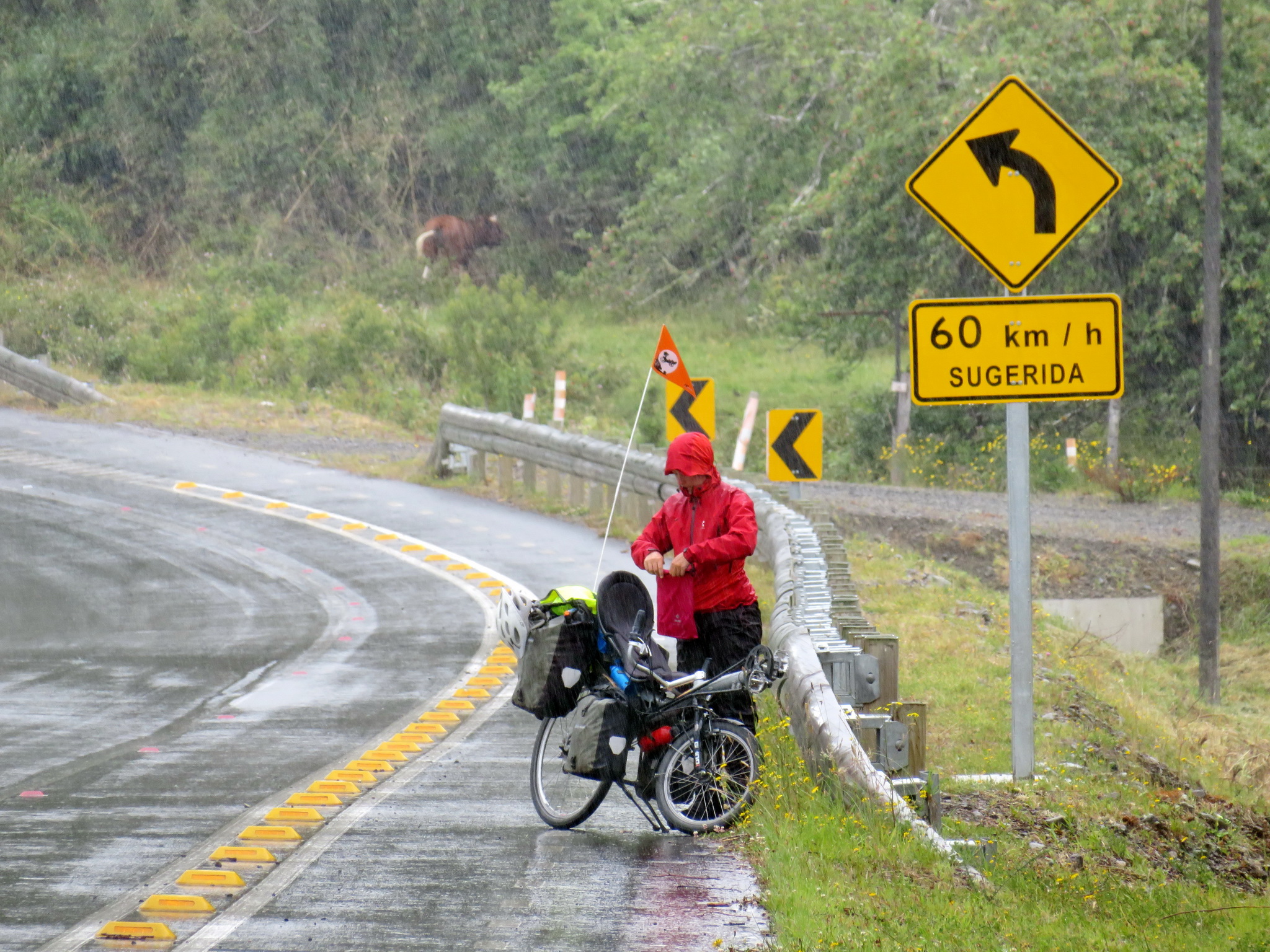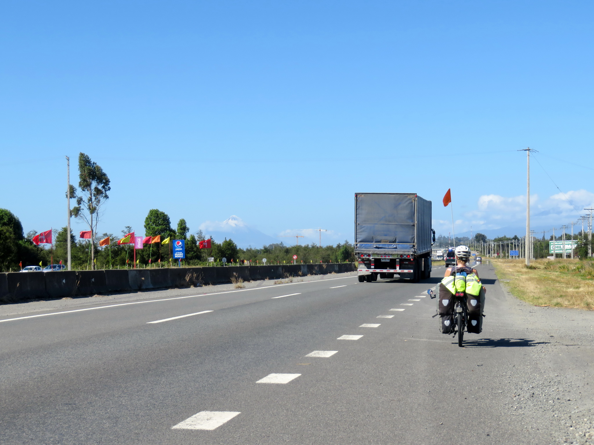 From there, it was all straight to Puerto Montt. Here, the Panamericana is a four-lane highway. Fortunately, there was a very large shoulder for us to ride on, protected from the vehicles speeding past. It was comfortable to cycle, albeit not beautiful nor interesting. There were few places to stop for a break, mostly bus stop shelters, and almost no shops or cafés.