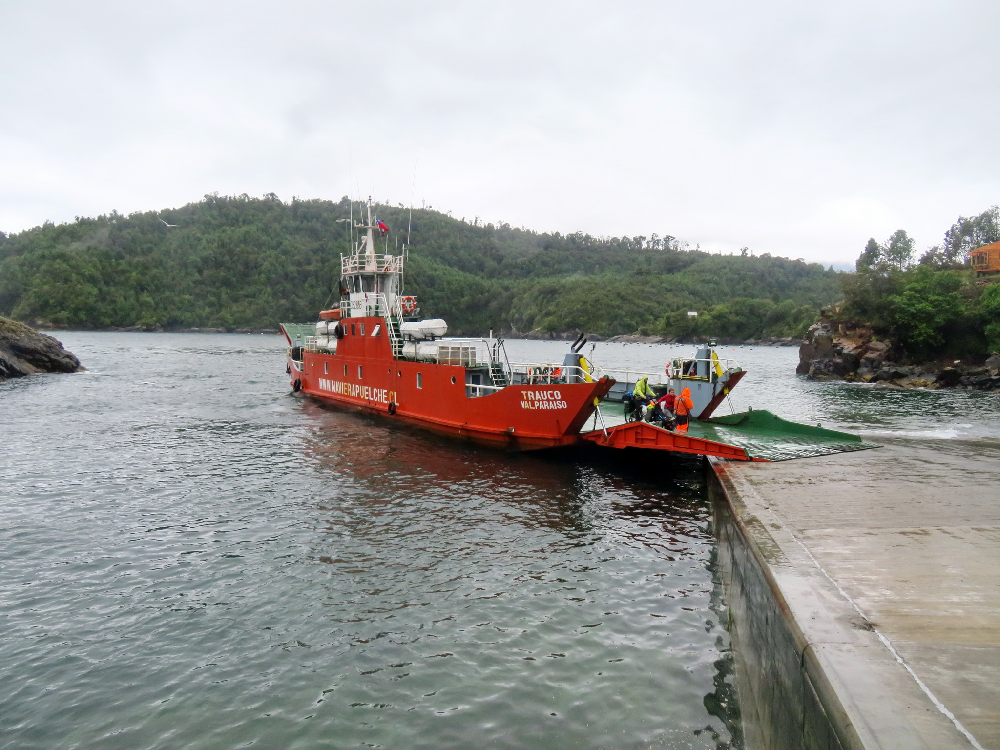 After Castro, we pedalled on to Ancud, on an unmemorable stretch of road which got worse as we approached Ancud, with bad asphalt and no hard shoulder. We slept in an overpriced campsite close to the beach near Ancud and continued to Chacao on the next day. We stopped in this small village to buy some food and get an instant coffee in one of the shops, and then hopped on the ferry taking us over to Pargua on the Chilean mainland.