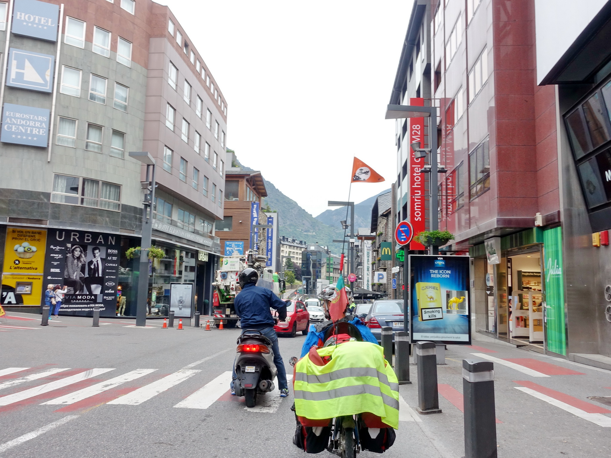 We just crossed Andorra on its main road, without venturing into the surrounding mountains and steep roads. On one day, we started in la Seu d’Urgell in Catalunya and cycled the twenty kilometres up to Andorra la Vella on the national road (there’s no other option). We had to share the road with numerous cars, trucks and motorbikes. Apart from the river down in the gorge and the steep, forested mountain flanks on both sides, there was not much nature around. The road is lined with service stations, supermarkets and shopping centres. The noisy traffic goes right through the town of Andorra and there’s little possibility to escape it, but it was all quite organized and not difficult to cycle through (although not very nice).