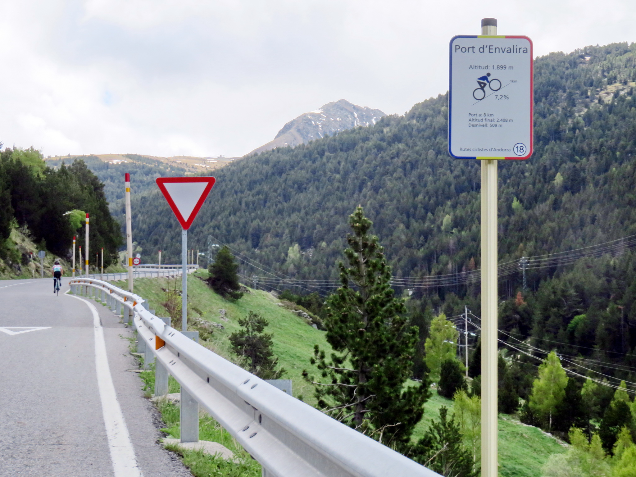 On the next day, after filling our stomachs at the hotel’s breakfast buffet, we continued pedalling up the same national road towards Port d’Envalira, the highest road pass in the Pyrenees. This seemed to be a well-known road cycling route, as there were signs every kilometre stating the current altitude, the next kilometre’s mean inclination, and the missing distance and elevation until the top.
