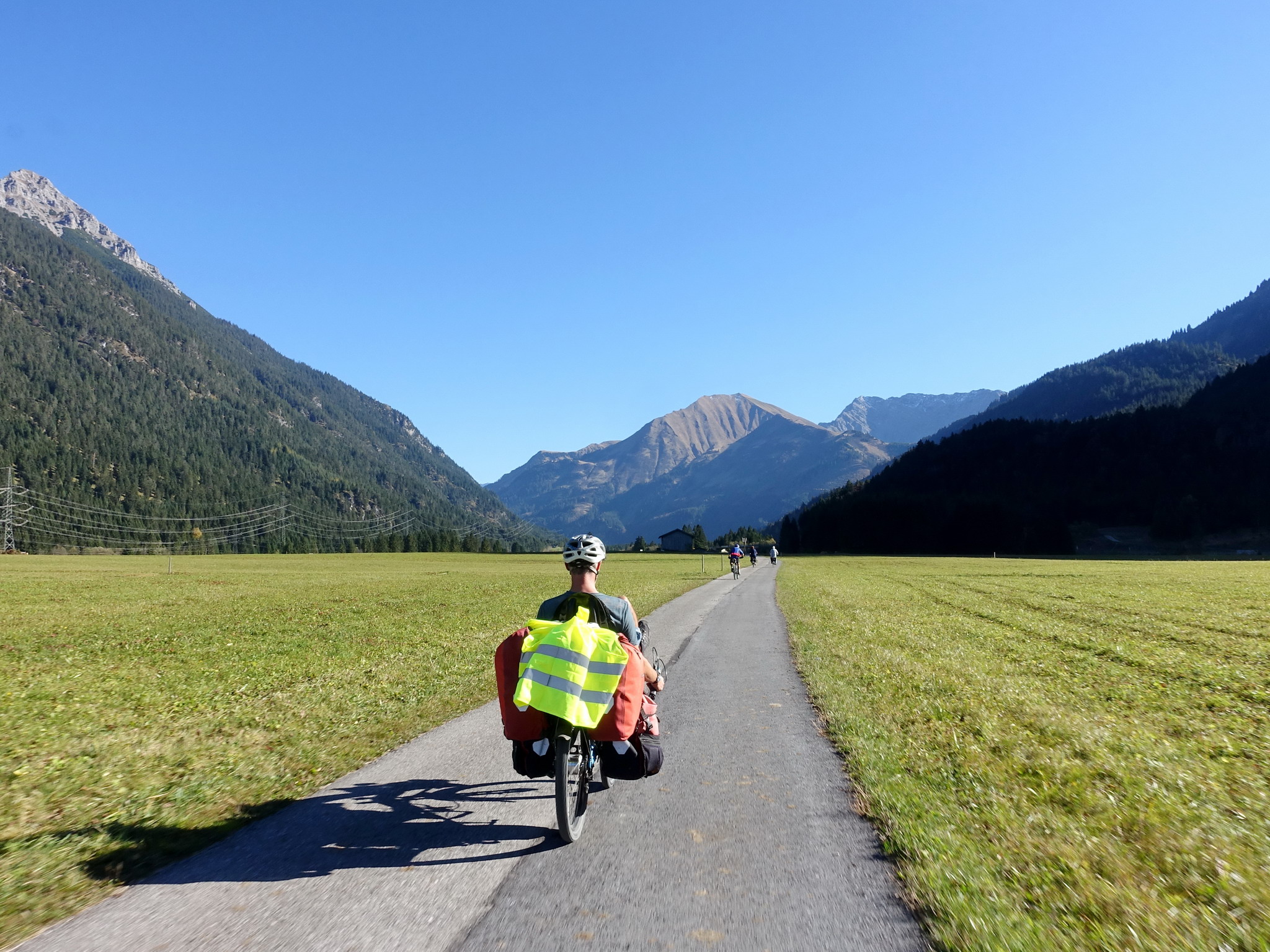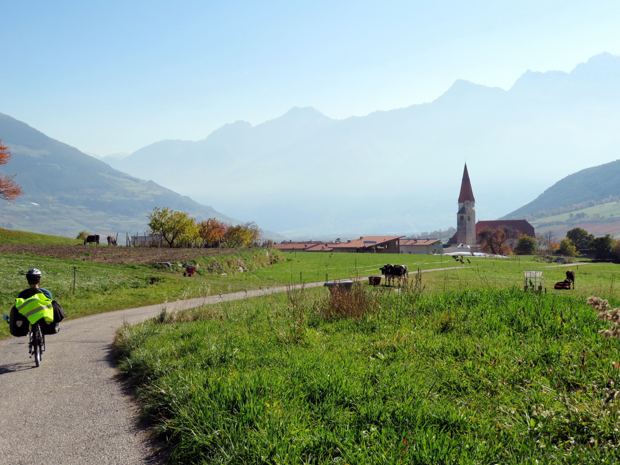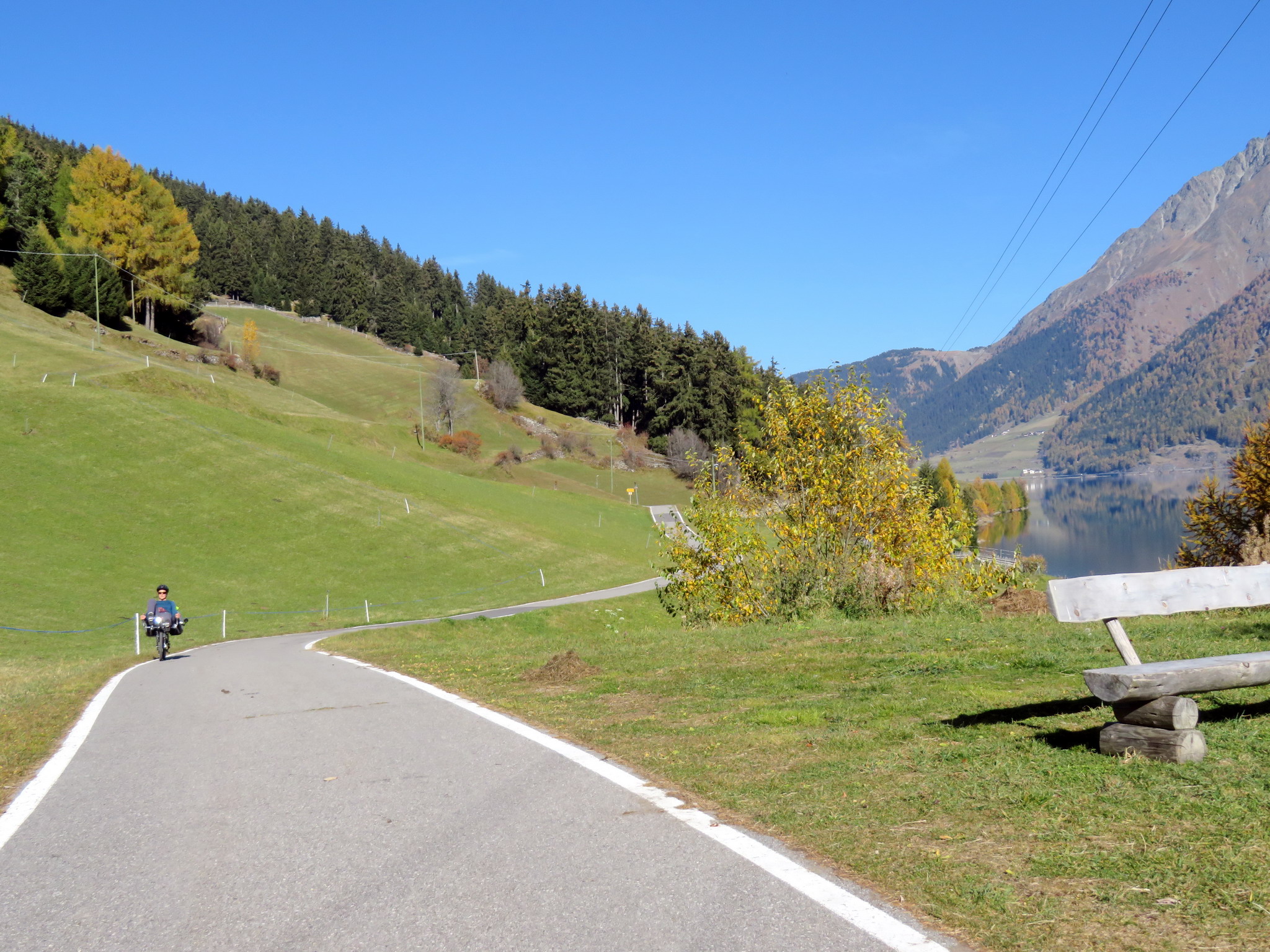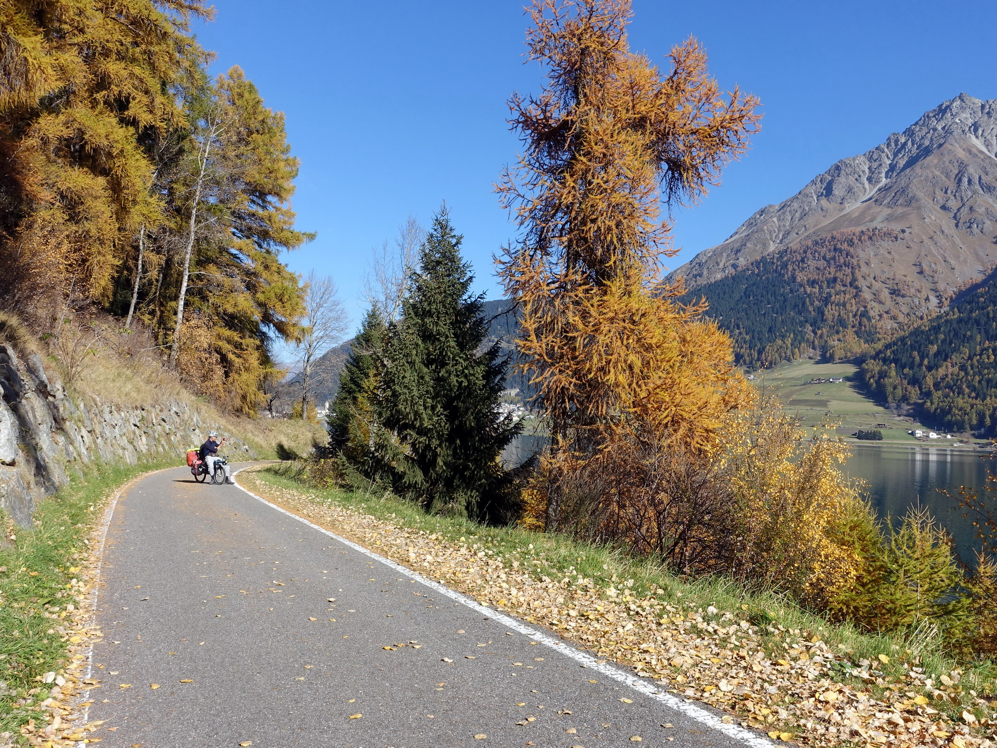 Now began an absolutely glorious part of this whole trip. A delicious cycle path, first undulating along the lake Reschensee, then going down into the valley to Mals and on. It was so tempting to just continue following this dream cycle route all the way to Venice or Verona. But, painfully, we were only on holiday and thus our time was limited. And, most importantly, the highlight of our trip was waiting for us.