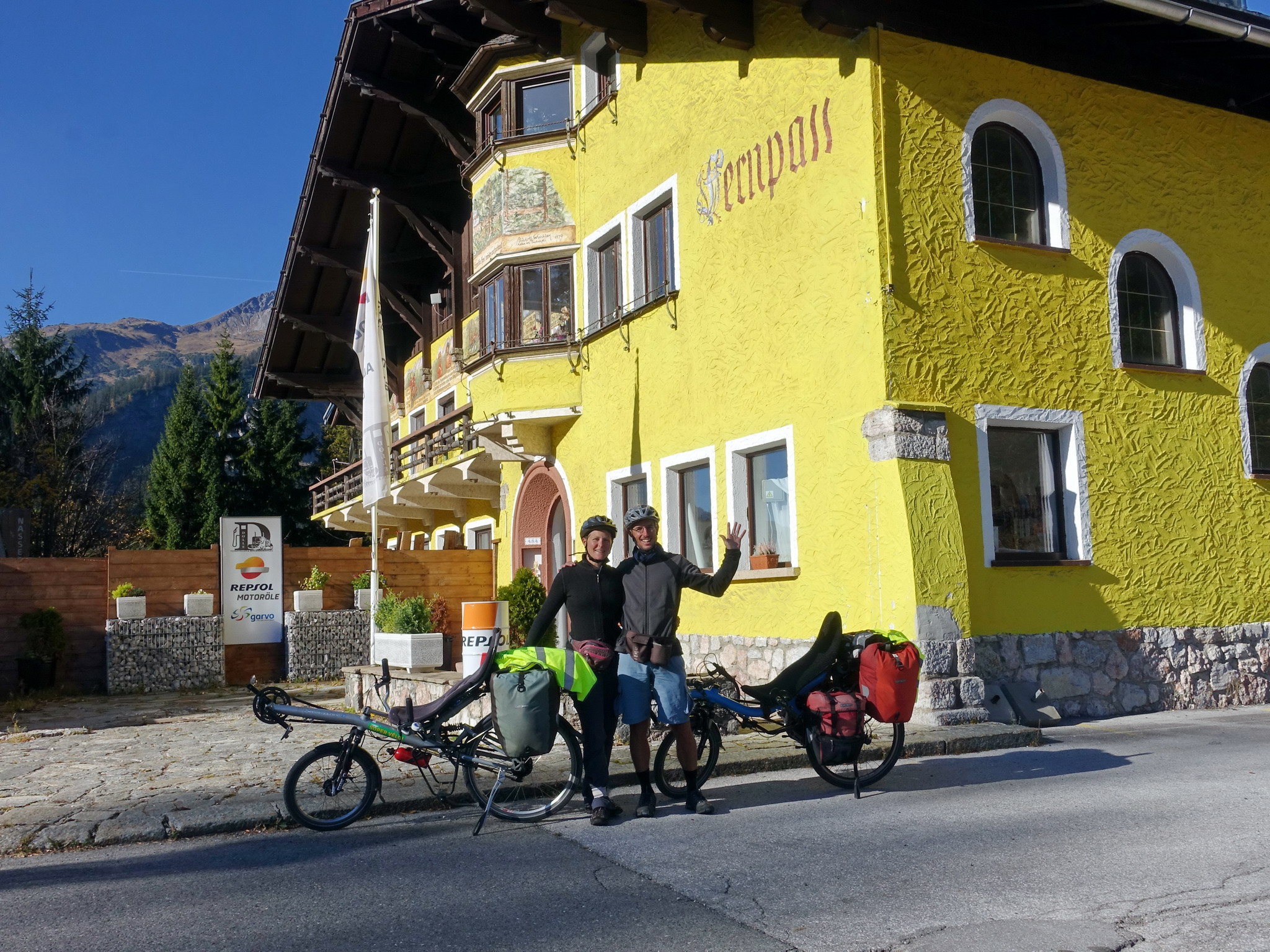 Our plan was to cycle up to the last village – Trafoi – before the long climb to the pass and spend the night there, to gain a bit of time and altitude before the next day. After all, we were climbing to 2700 metres altitude, so we could use a little headstart. Arrived in Trafoi in the early evening, we were confronted with bad news: None of the hotels or guesthouses were open, and we didn’t manage to negotiate an exception in the places where we found someone to ask. So, we had two options: either to camp wild somewhere, or to cycle back down a few kilometres to the last village (Gomagoi) and lose 300 metres altitude. Given that we were at 1530 metres altitude and that it was already very cold in the early evening, the idea of wild camping didn’t appeal much to us (there wasn’t even a restaurant in the village where we could have warmed up). So we reluctantly chose the second option. In less than 20 minutes of freezing downhill we were back to where we had taken our afternoon break, and in a warm hotel room, with the added benefit of a good dinner and a buffet breakfast the next morning.