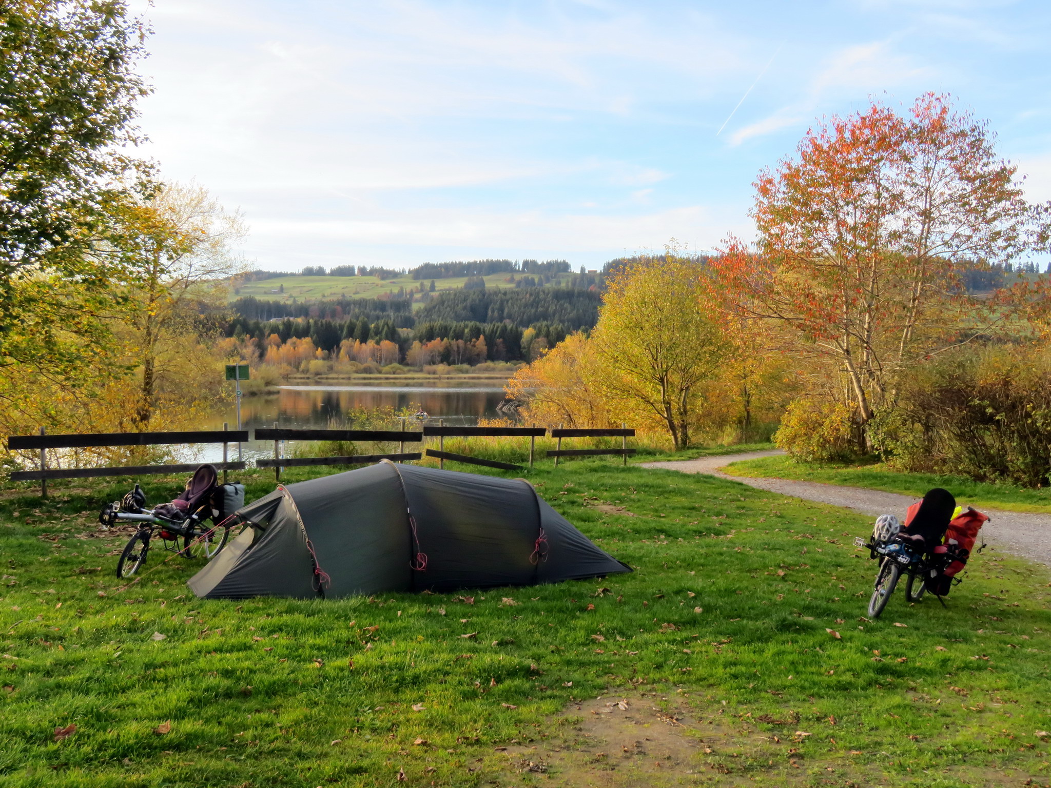 In the afternoon, we decided to find a campsite. A disadvantage of cycle touring in autumn is that it gets dark (and cold) early. The region didn’t seem very suitable for wild camping – it was all fields, most of which had just been fertilized with cow dung… We managed to hunt down an all-year-round open campsite next to a lake (Güntensee). It wasn’t cheap but it was nice: nicely heated bathrooms, a perfect hot shower, a picnic table, and a restaurant for the (very important) after-cycling beer.