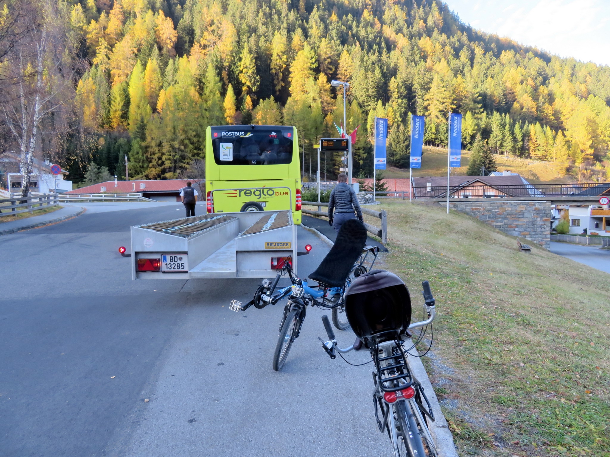 The Inn cycle route was nice and mostly sparate from the main road, but from the town of Landeck it was in the shade, and by the end of the afternoon we were freezing. We put up our tent in the campsite in Ried, took an indescently long hot shower, and went off for dinner in a warm restaurant. The only one we found was a Turkish fast food kind of place, but at least it was warm, and we spent some time there planning the next day. We had been getting on more slowly than originally expected, so we were facing a problem: we didn’t have enough time left to cycle all the way to the Stelvio (both in terms of time we could spend on this vacation, and in terms of the weather forecast – we had only two sunny days left). We found out that there was a postbus going almost all the way up to the next pass, and it was supposed to carry a trailer for bicycles. Would the bus take our recumbents?