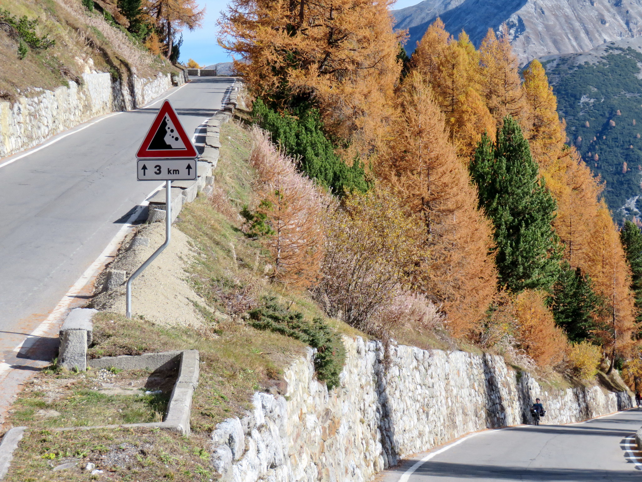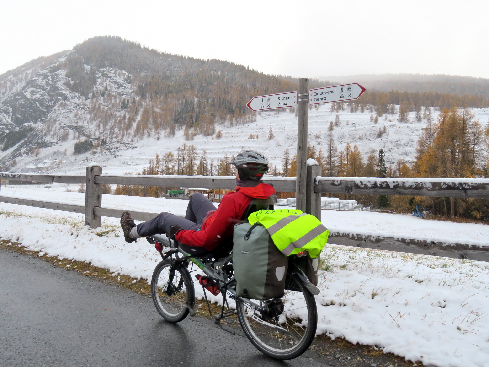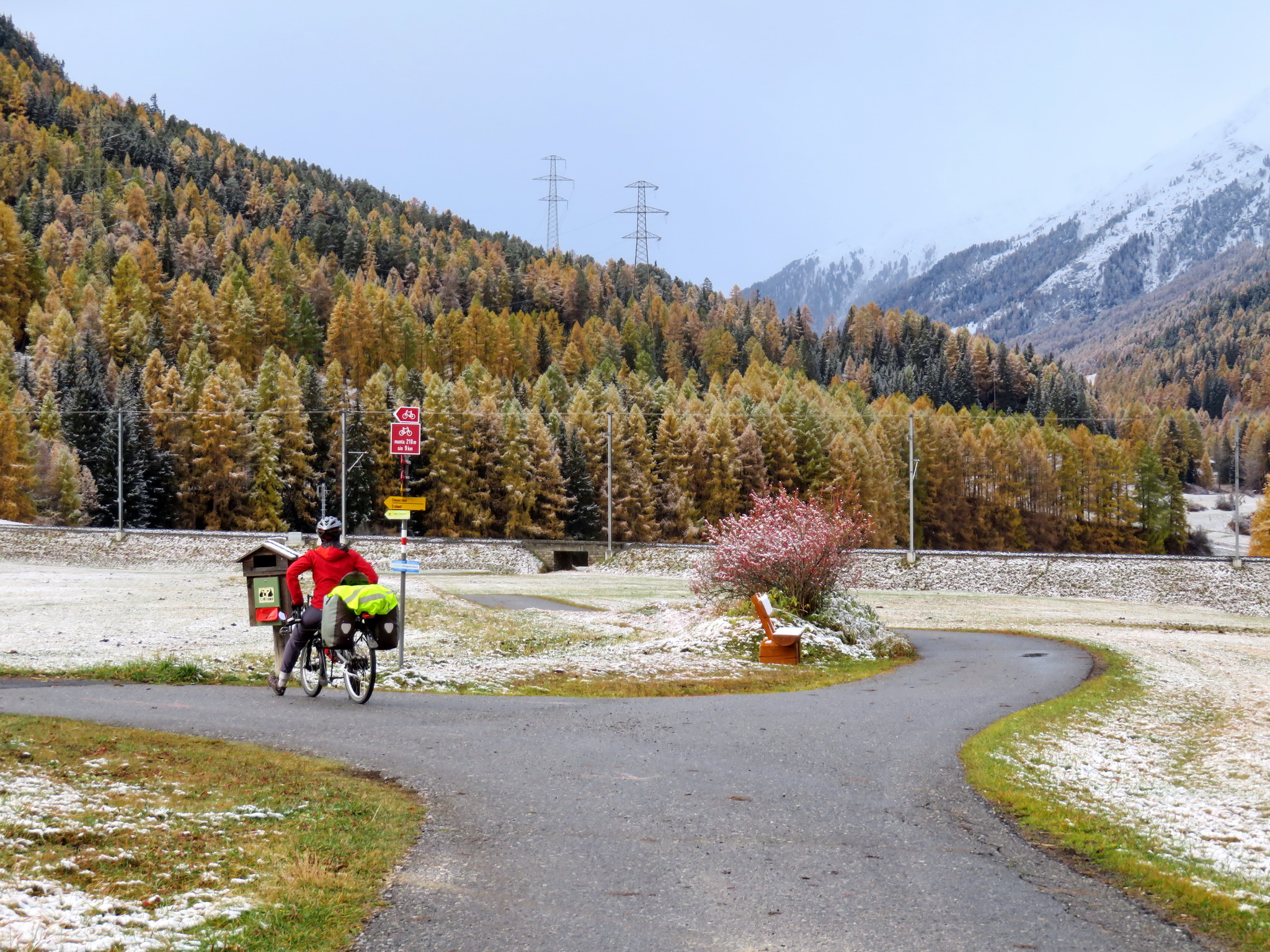 We arrived at the top in time for lunch, which we took in the restaurant in the form of a hot soup. It had started snowing and picknicking outdoors was not tempting! We then dressed very warmly for the ride down to Zernez. This part of the road was insidious, because after an initial downhill it flattens and then climbs again, making us sweat like crazy in our winter clothes. We arrived in Zernez in the afternoon and checked into a hotel with a small spa, where we spent the rest of the afternoon – we think we deserved relaxing in a hot sauna!
