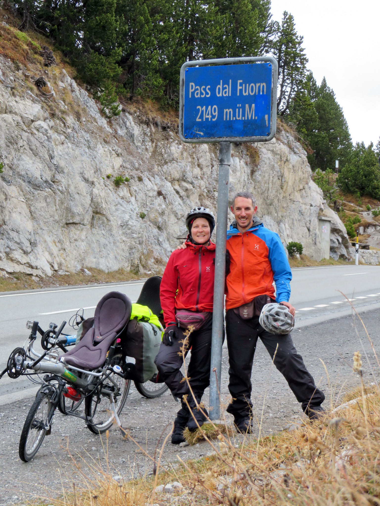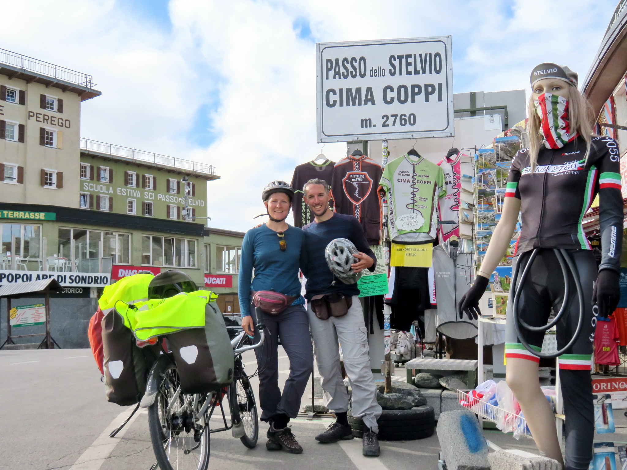 By mid-afternoon we made it to the top. We were so proud of having managed to cycle up one of the highest road passes in the Alps! We had seen a few other cyclists on the way – all road cyclists on their fancy hyper-light carbon road bicycles. But we had managed too on our heavy “tanks”! Surprisingly there was no proper “photo spot” up there, we had imagined a big sign where all the cyclists would take their selfie – after all this is one of the road cyclists’ “trophies”. We had to make do with a small sign next to the tacky souvenir shops.